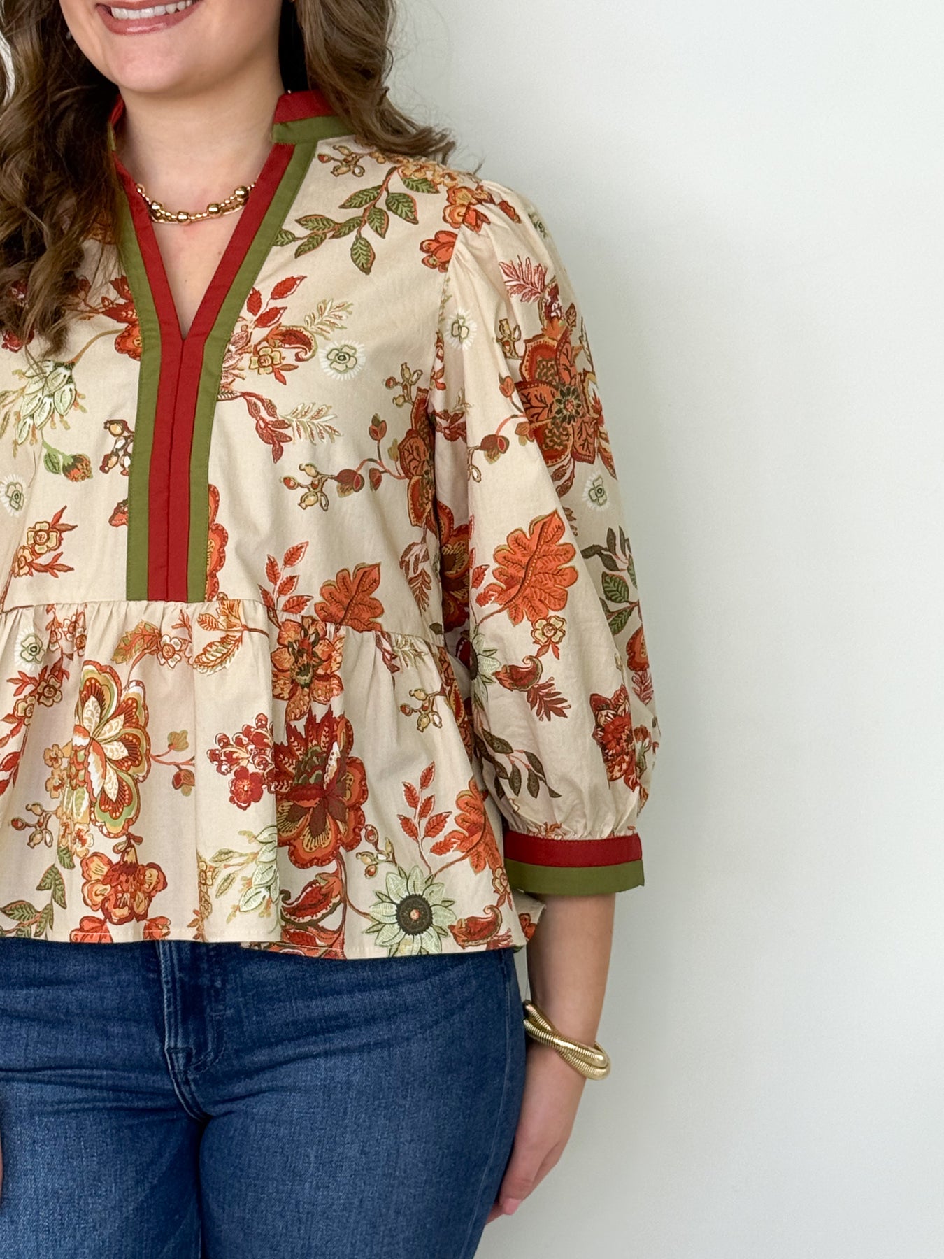 Elevate your wardrobe with this sophisticated botanical print blouse, designed for effortless style. The flattering V-neckline is accented with contrast binding, while the peplum waist creates a refined silhouette. Crafted from lightweight woven fabric that's non-sheer and unlined, the ¾ sleeves offer versatile layering options. Perfect for transitioning from office to weekend occasions with polished ease.