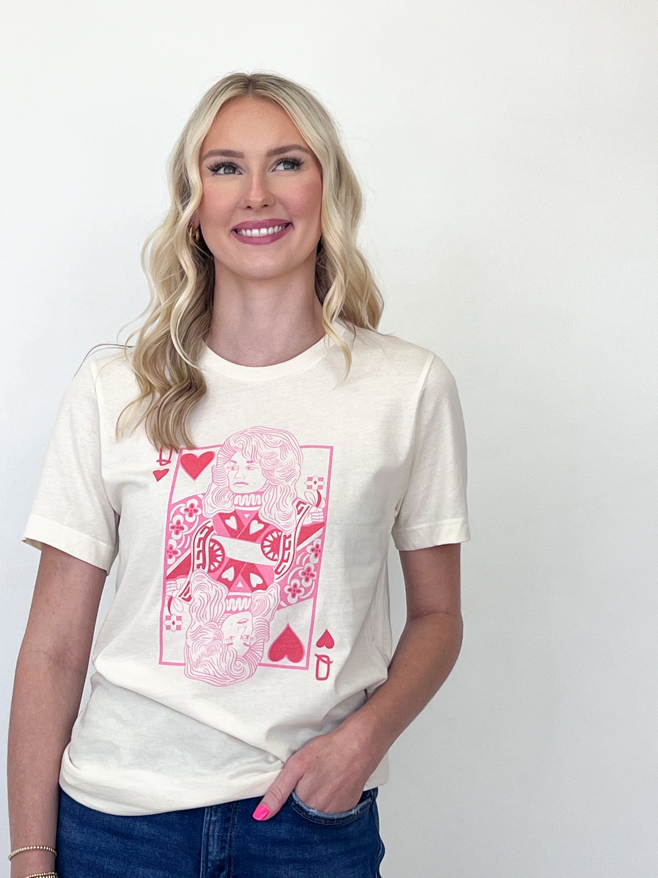 Unleash your inner wild child with our Dolly Queen of Hearts Card graphic tee! Printed on soft, cream-colored Bella Canvas fabric, this tee features the iconic Dolly Parton and is true to size for a comfortable fit. Get ready to turn heads and make a statement in this super soft and playful tee.