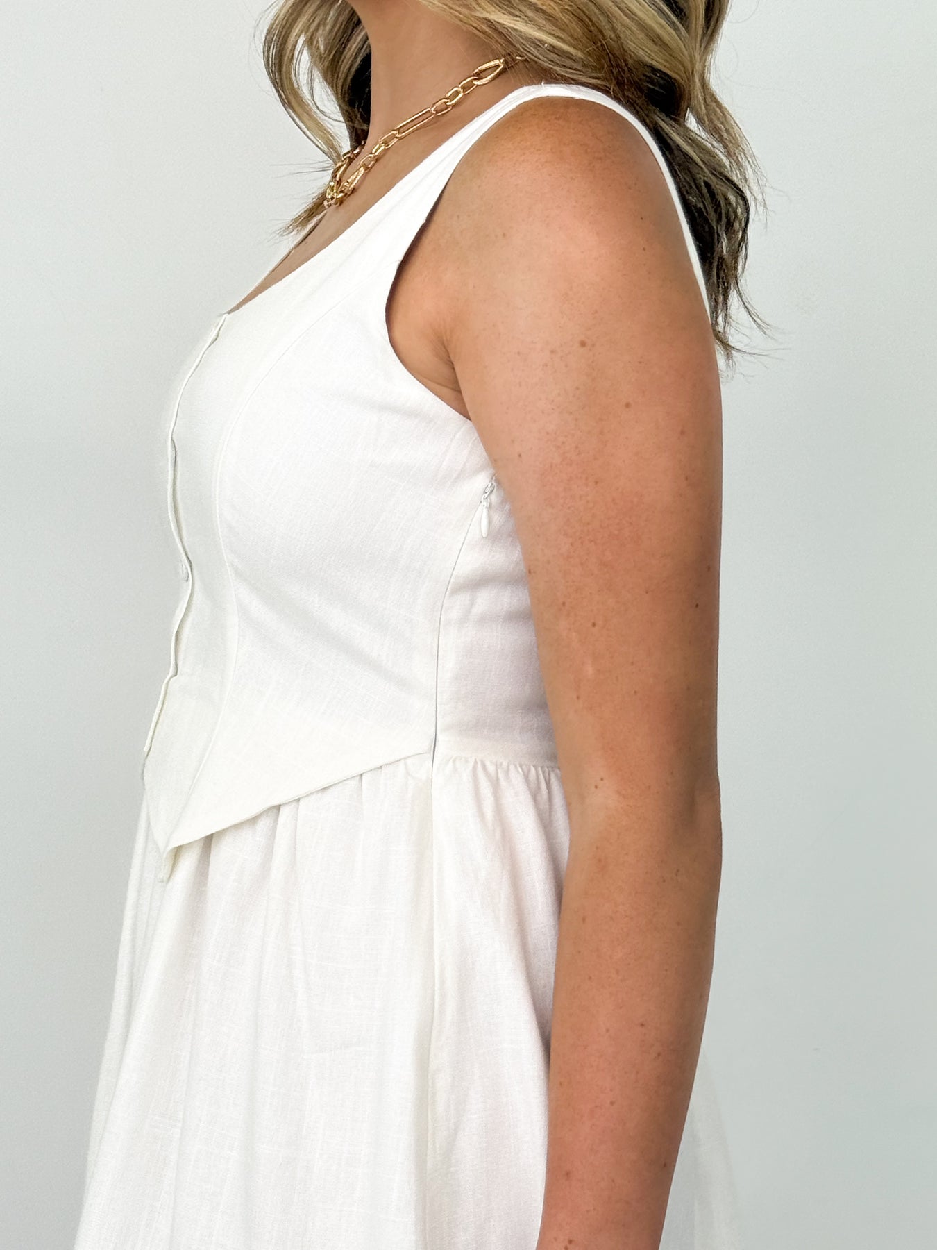 Unleash your inner fashionista with Jordyn - the perfect off white mini dress that features a playful button down vest detail and a hidden zipper on the side. Stand out in style and comfort with this quirky yet chic dress.