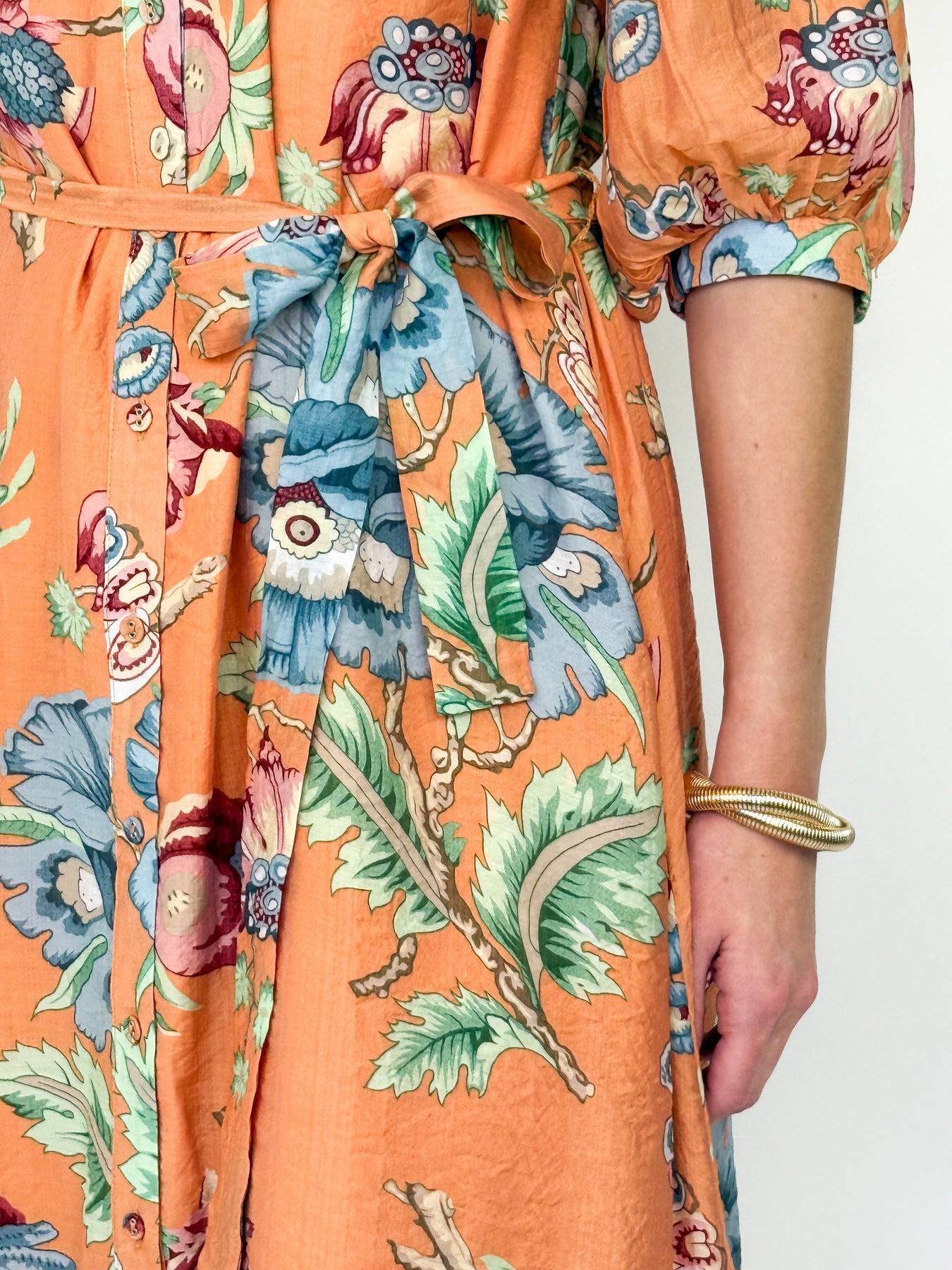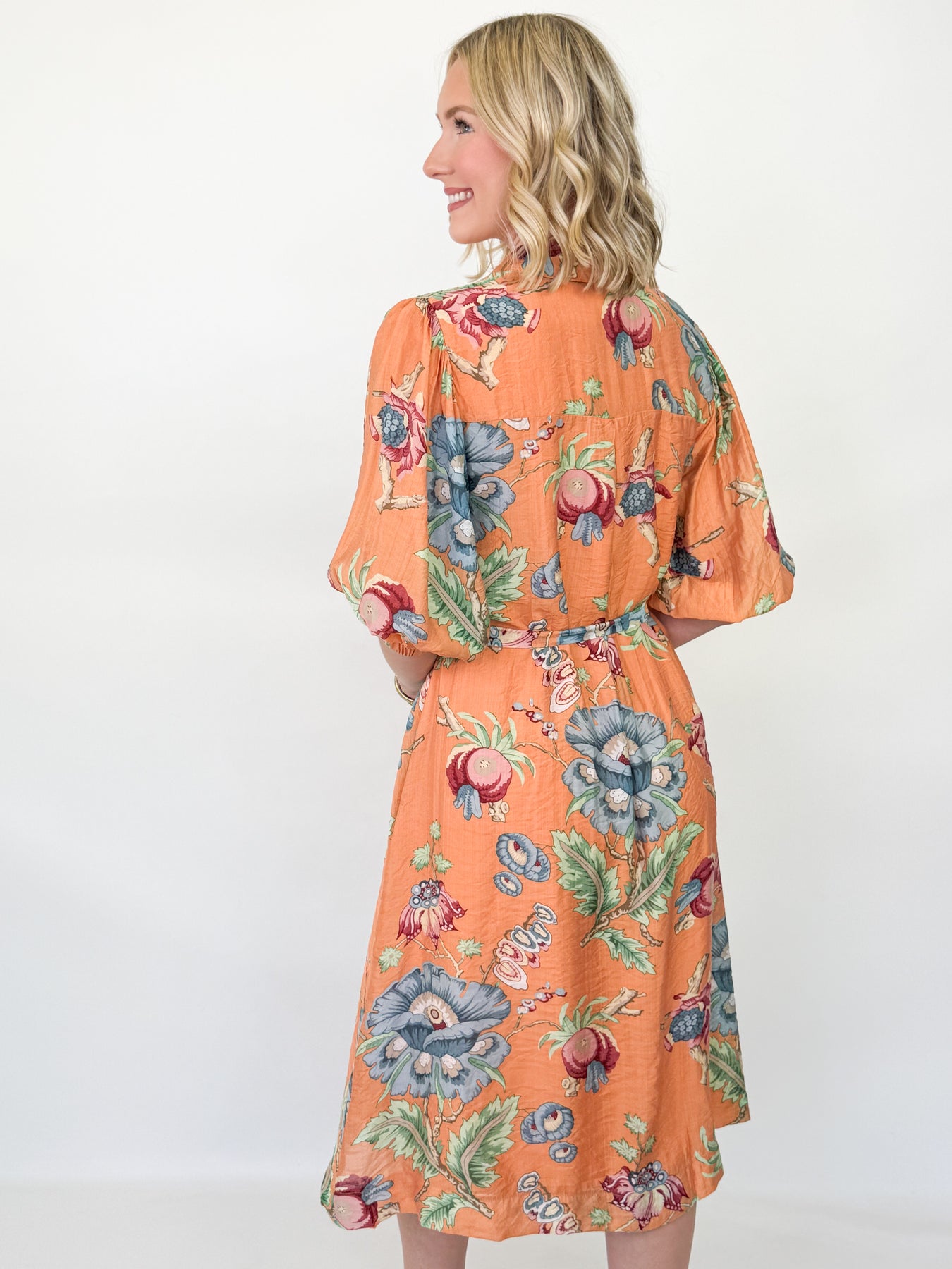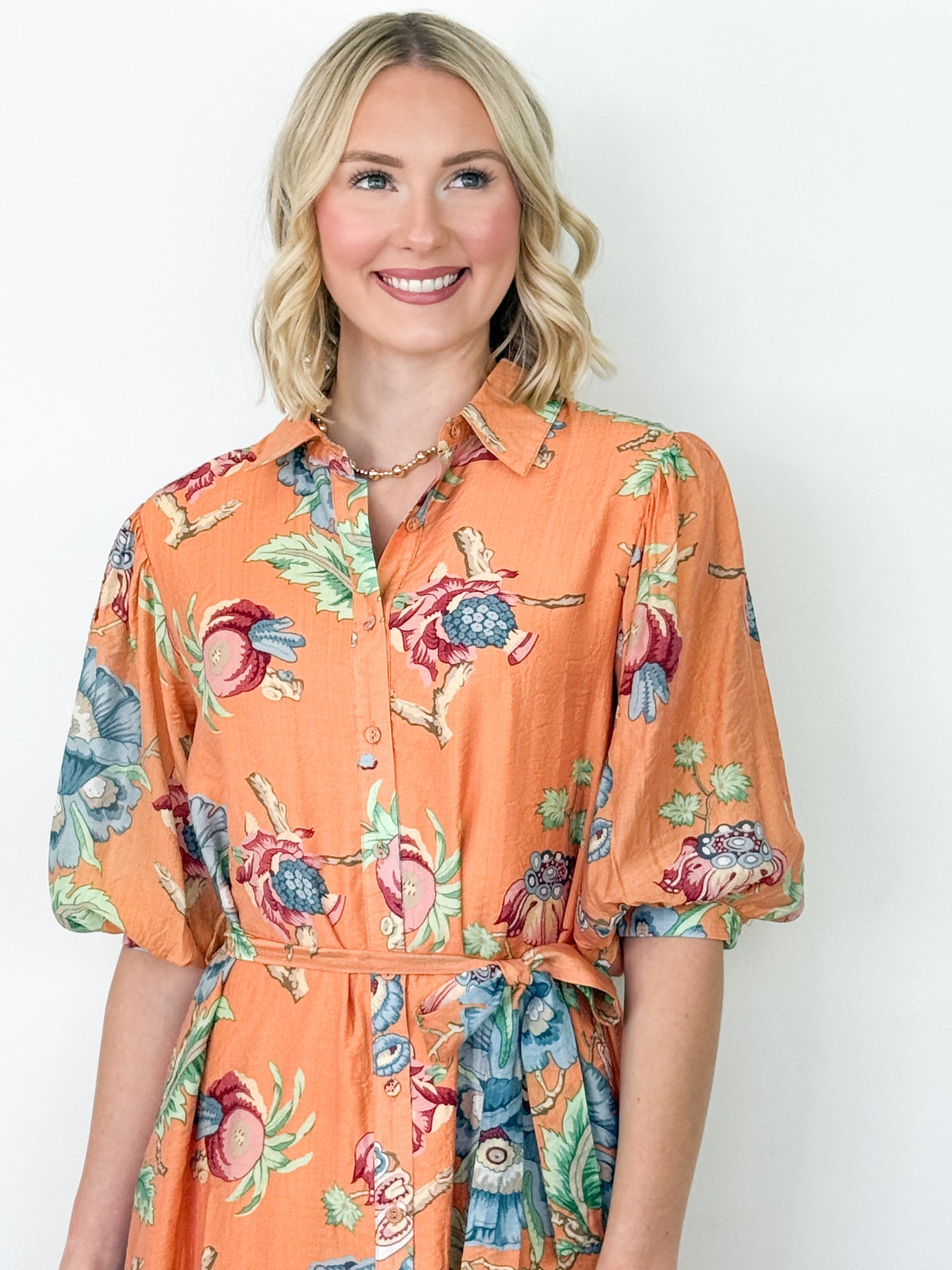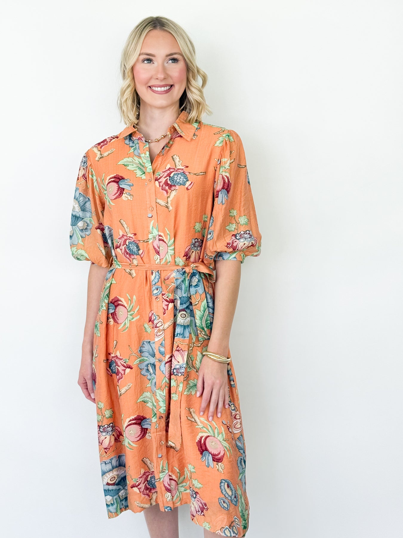Brighten your day with the Lexi Floral Button Front Midi Dress. This playful orange dress features a charming collared neckline, 3/4 sleeves, and a flattering tie at the waist to highlight your silhouette. The button-front detail adds a touch of fun, making it perfect for sunny outings or casual gatherings. Embrace effortless style and comfort in this vibrant floral midi dress.