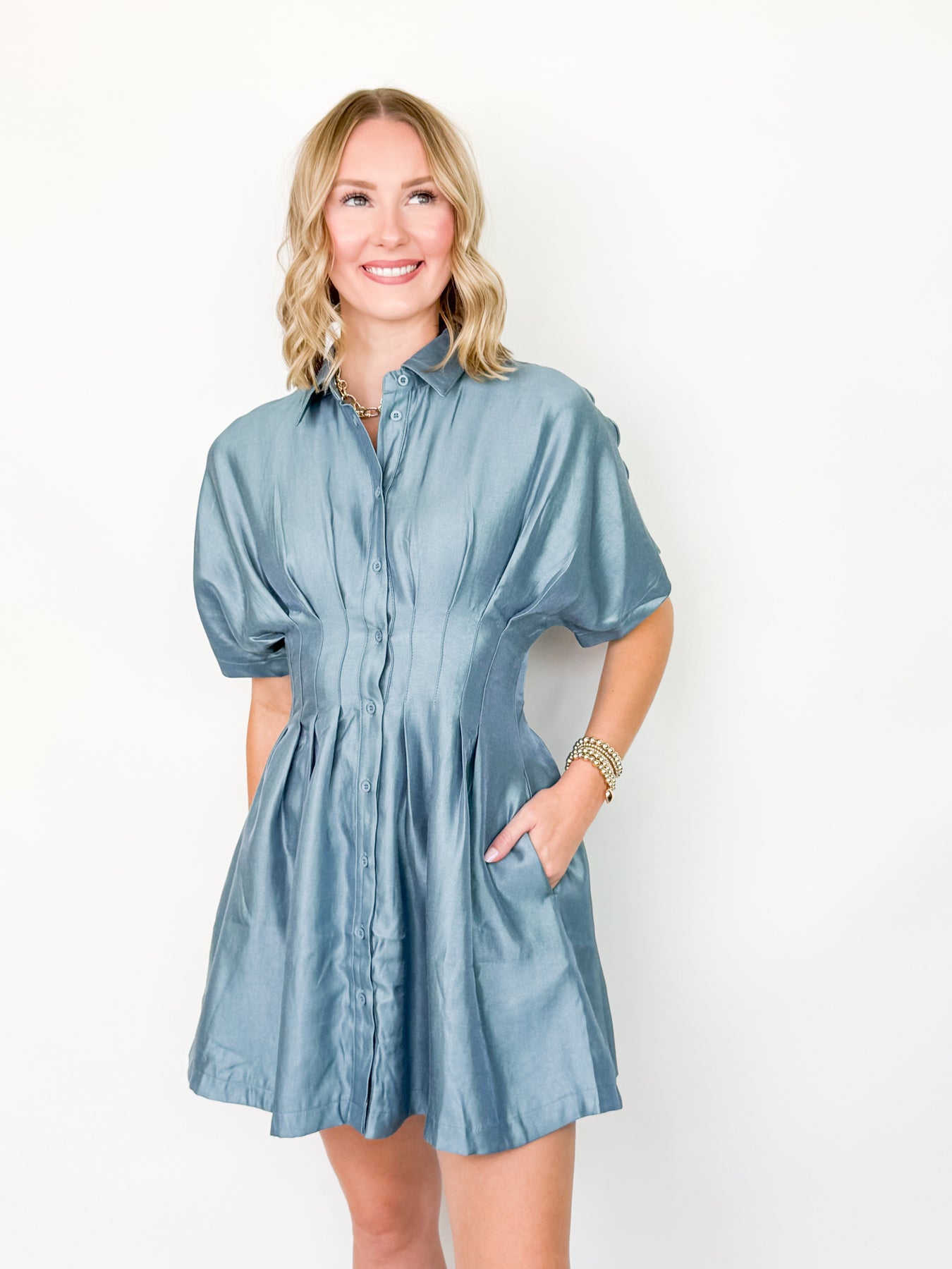 This button-down mini dress combines refined style with subtle sheen, crafted from a delicate blend of 84% rayon, 10% polyester, and 6% nylon for a soft, fluid drape. Its crisp collar and elegant kimono sleeves add a modern touch, while functional pockets provide convenience without compromising the dress’s sleek silhouette. Perfect for sophisticated day-to-night dressing.