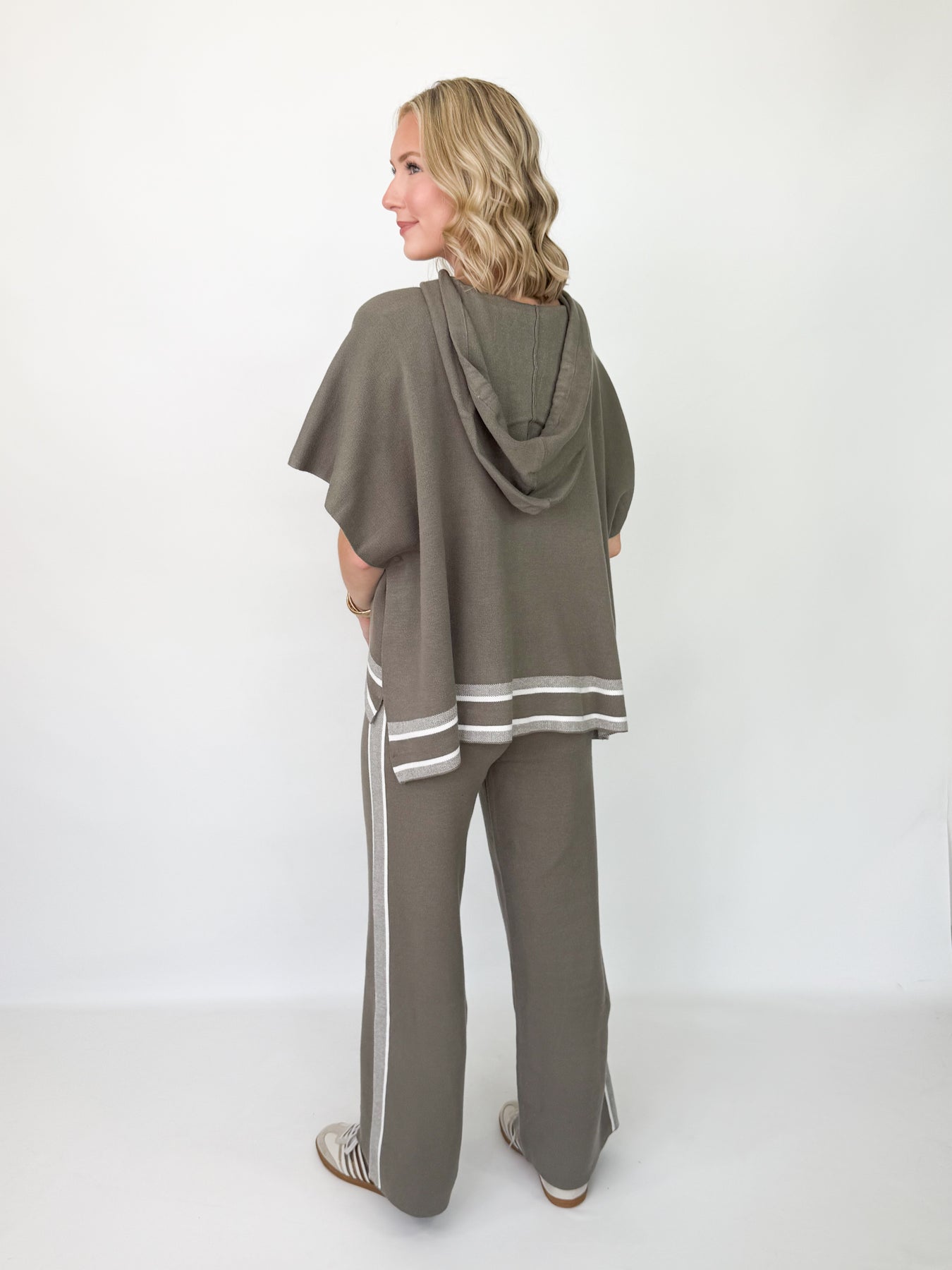 Stay cozy and stylish in the Belinda Olive Knit Hooded Top Set. This playful outfit features a soft olive knit with a hooded poncho top, complete with convenient side snaps for easy wear. The white striped hem and matching stripes along the pants add a fun, sporty touch. Perfect for relaxed days or casual outings, this set combines comfort with a dash of charm.