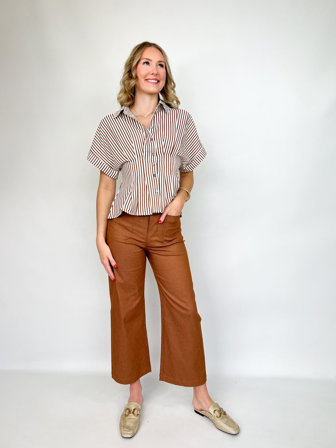 Add a fun twist to your wardrobe with this playful brown and cream striped pintuck blouse. Featuring a flattering peplum silhouette, button-down front, and short sleeves, it’s perfect for mixing casual charm with a touch of elegance. The collared neckline adds a classic detail, making it just right for day-to-night looks.