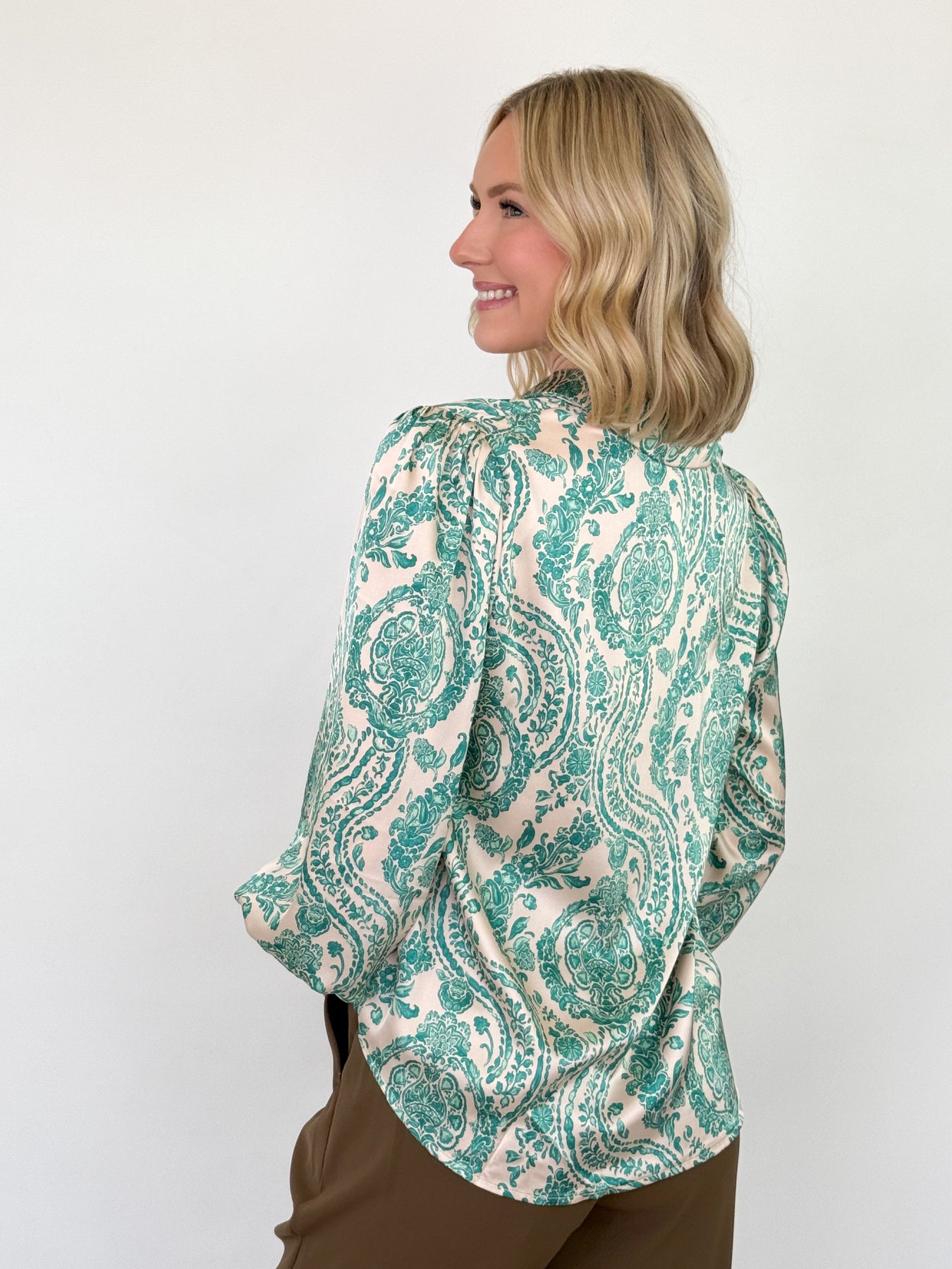 Introducing Christa - the blouse that's sure to make you stand out with its emerald print. Breathable satin material keeps you cool while the collared neckline and smocked sleeves add unique touches. Perfect for adding a pop of color to your wardrobe.
