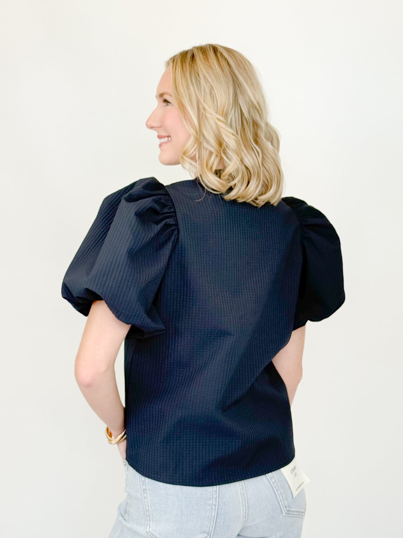 Elevate your wardrobe with the Danielle V Neck Puff Sleeve Top in a rich navy hue. This blouse features a flattering V neckline and elegantly structured puff sleeves, blending classic sophistication with a modern touch. Perfect for both professional settings and refined casual occasions, it offers a polished look that enhances your silhouette with subtle volume and graceful lines.