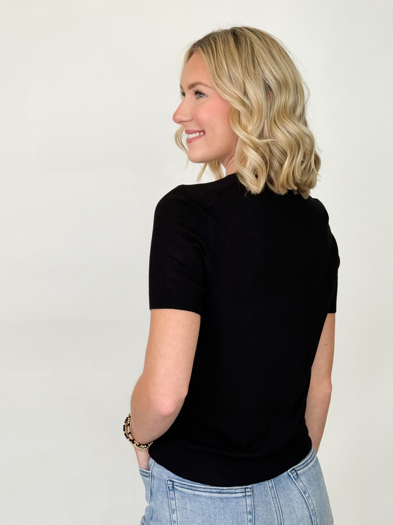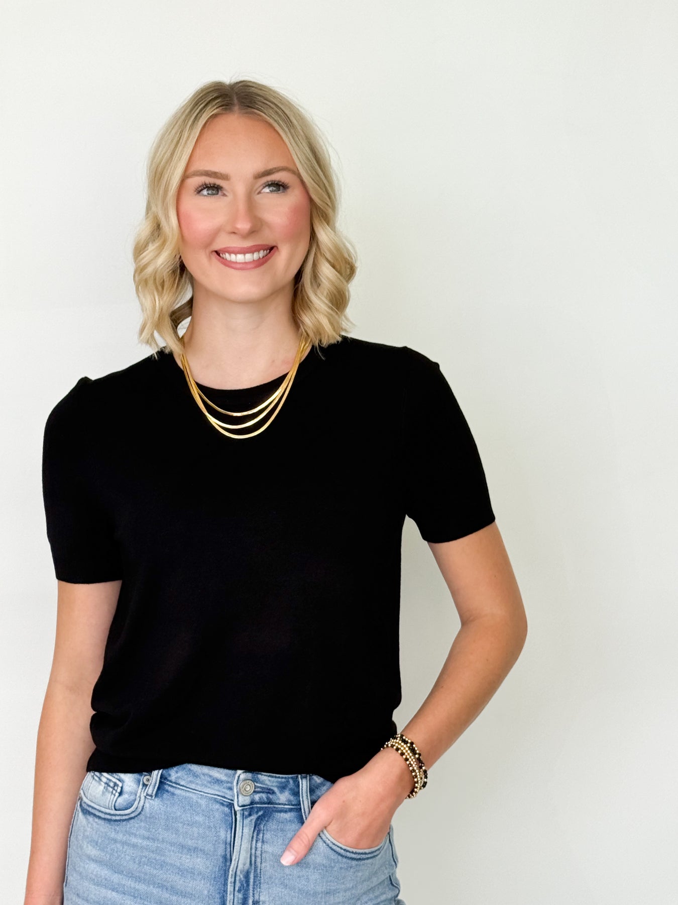Meet your new favorite tee: the Elle Short Sleeve Knit Tee. This lightweight, black knit top is perfect for layering or wearing solo on sunny days. Its soft fabric and comfy fit make it easy to move and groove all day long. Dress it up or down—either way, you’ll look effortlessly cool and feel great!