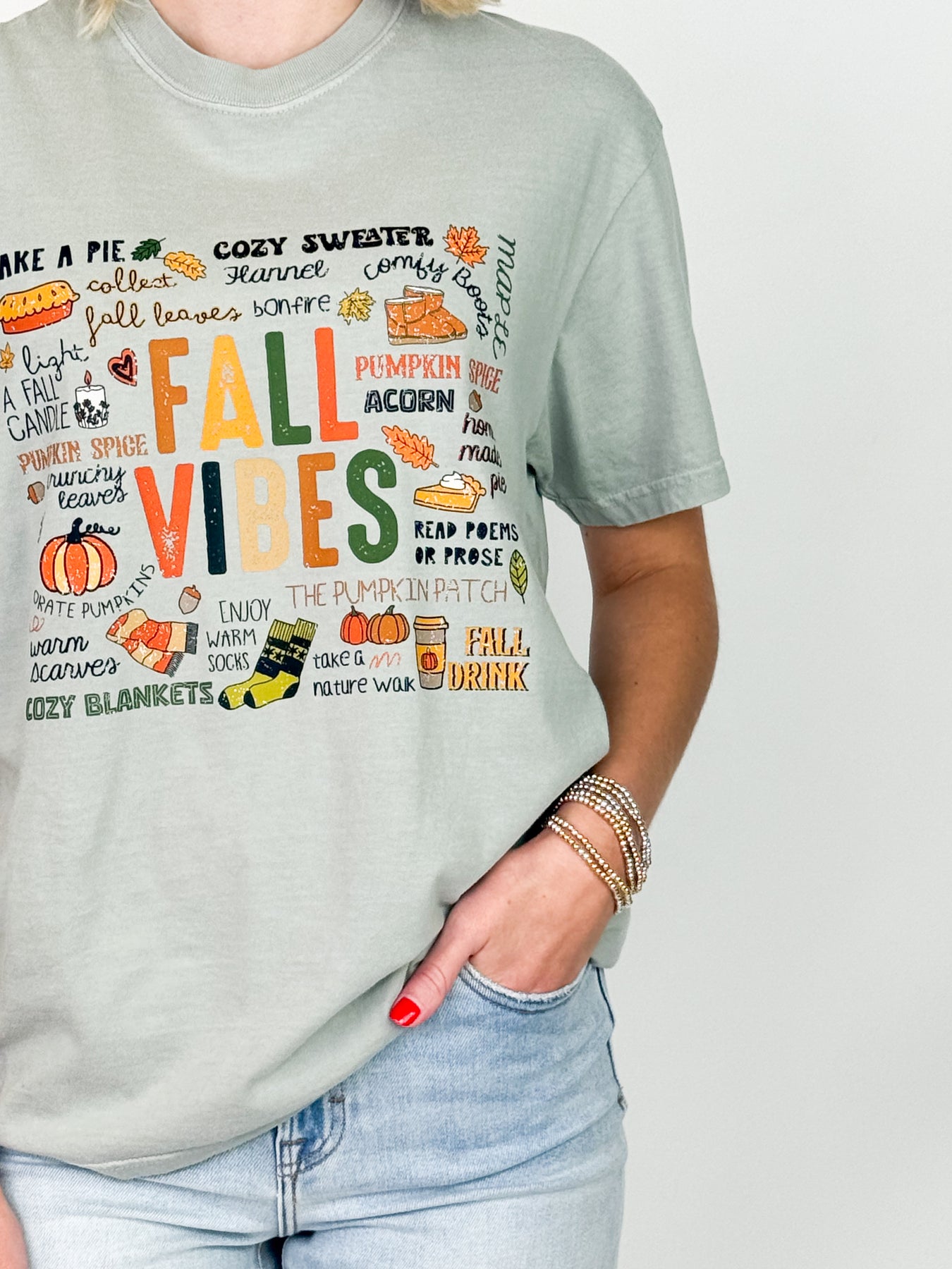 Introducing our Fall Vibes graphic tee! Printed on a sage green comfort colors short sleeve tee with fall-themed words and graphics, this tee is perfect for embracing the cozy season. Elevate your wardrobe and express your love for fall with this exclusive piece.