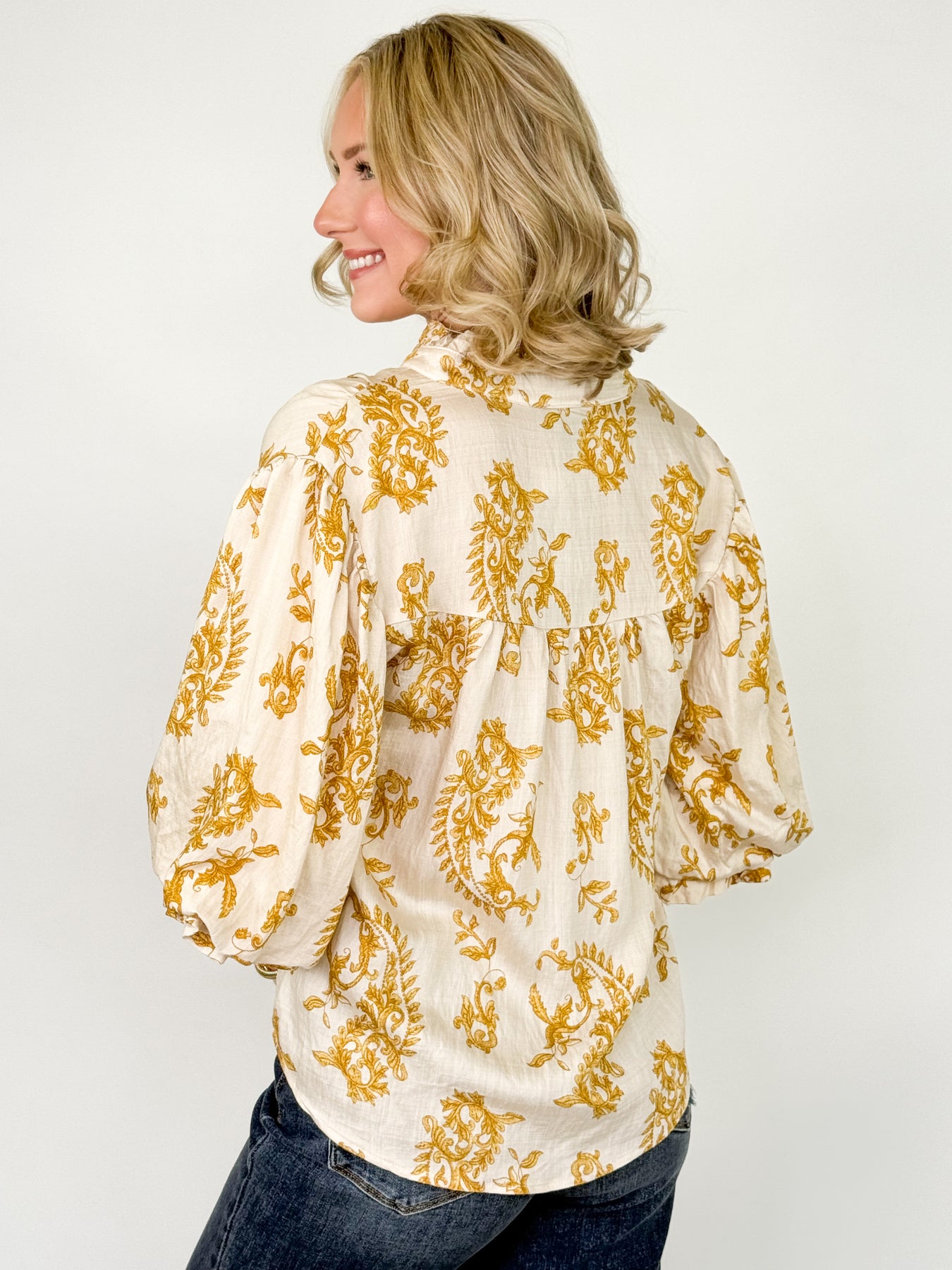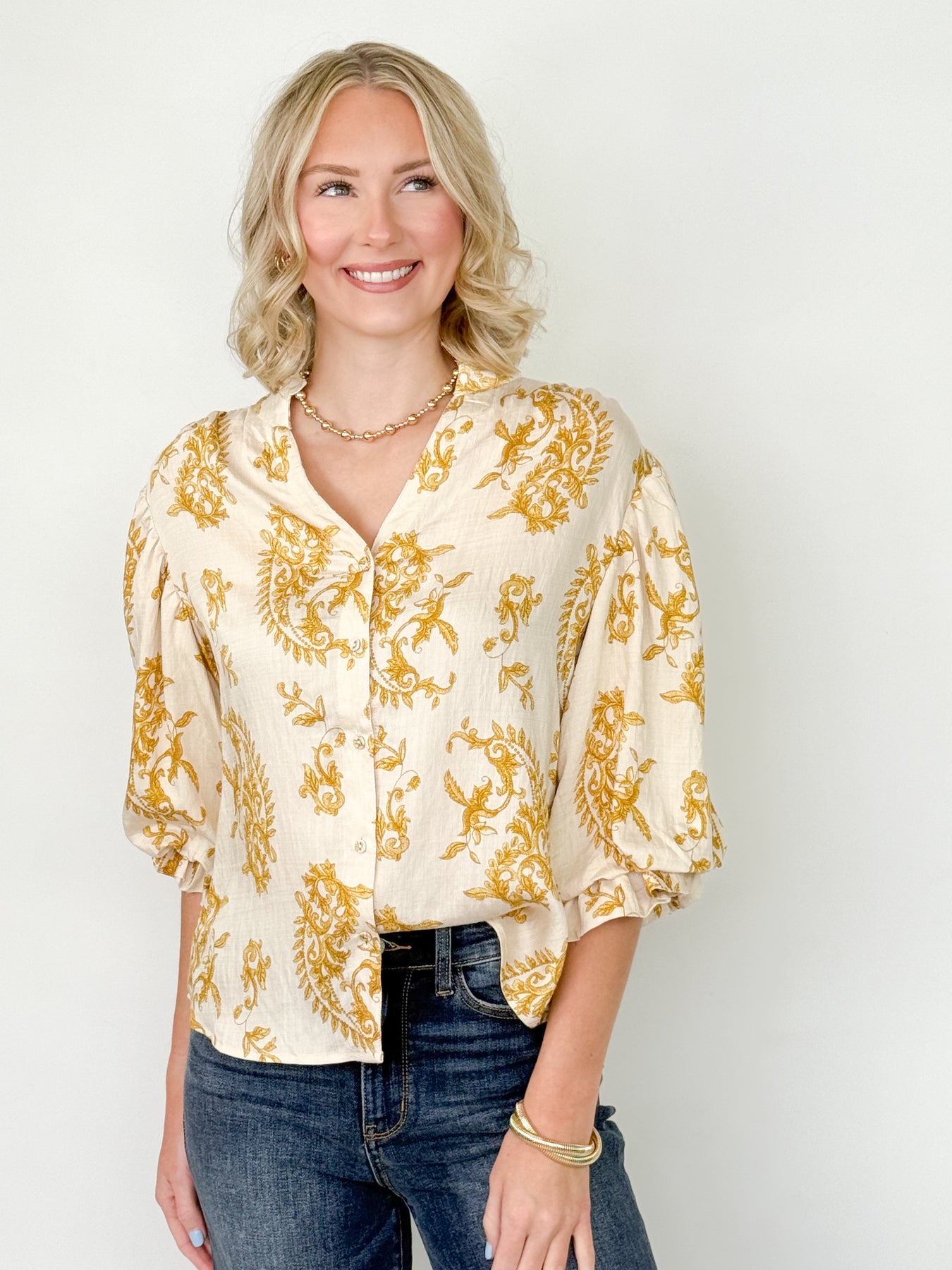 Jaylen - Printed 3/4 Sleeve Button Down Blouse (Mustard)