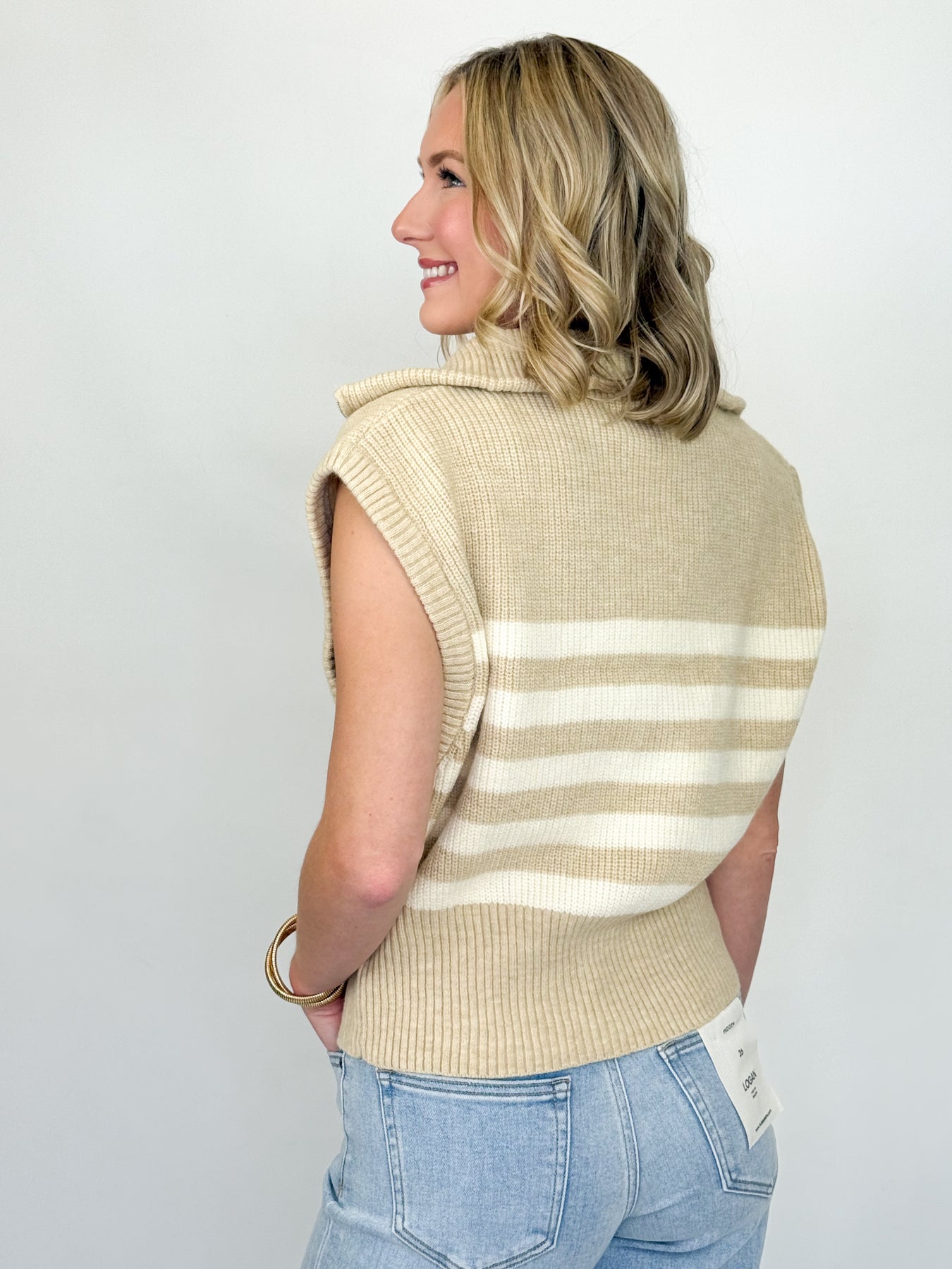 Add a fun twist to your outfit with the Kaitlyn Beige Striped Knit Half Zip Top. Featuring cheerful beige and white stripes and a playful half-zip detail, this cozy knit piece is perfect for mixing comfort with a splash of personality. Whether layered or worn solo, it brings a lighthearted vibe to your everyday style.