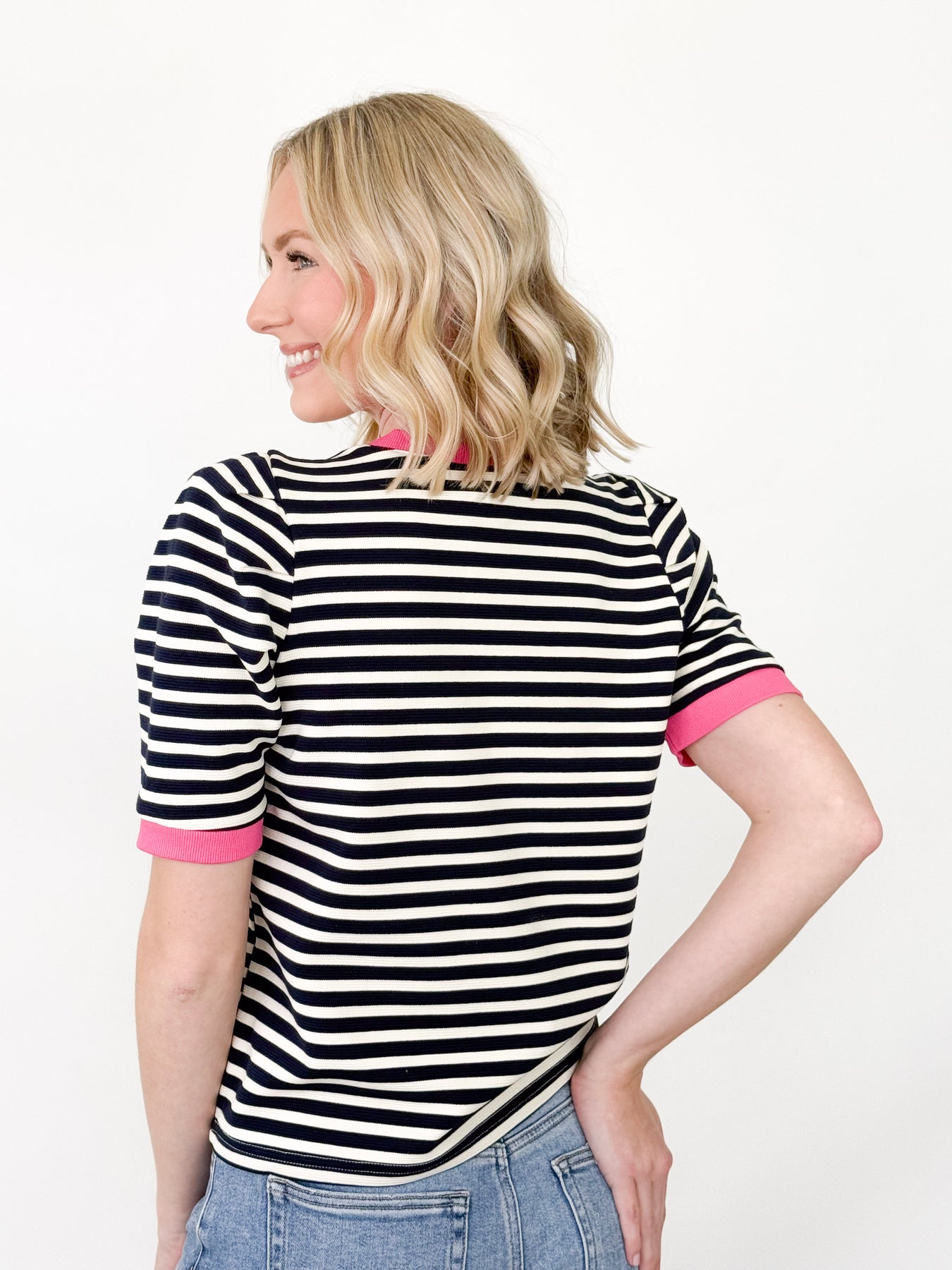 Update your wardrobe with Kimmy, the perfect combination of style and comfort. Featuring a playful navy striped knit fabric with a pop of pink trim and fun puff sleeves, this top is sure to make a statement. Stay trendy and comfortable with Kimmy's unique design. Also available in Pink.