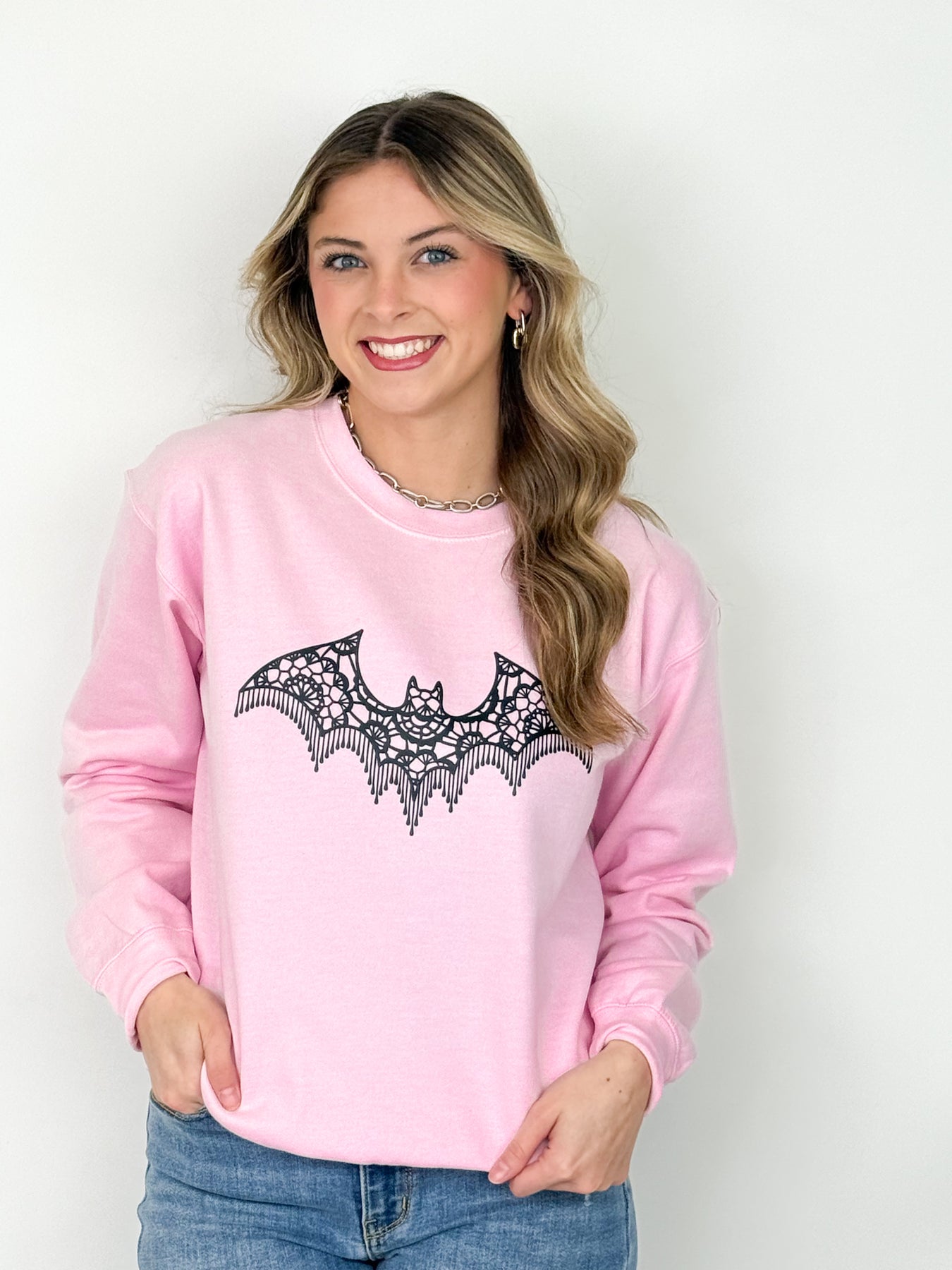 Get into the Halloween spirit with this pink sweatshirt featuring a playful black lace bat graphic. Made from soft, comfortable fabric, it’s perfect for cozy fall days and spooky nights. The delicate lace design adds a unique twist to your seasonal wardrobe, blending comfort with festive fun.