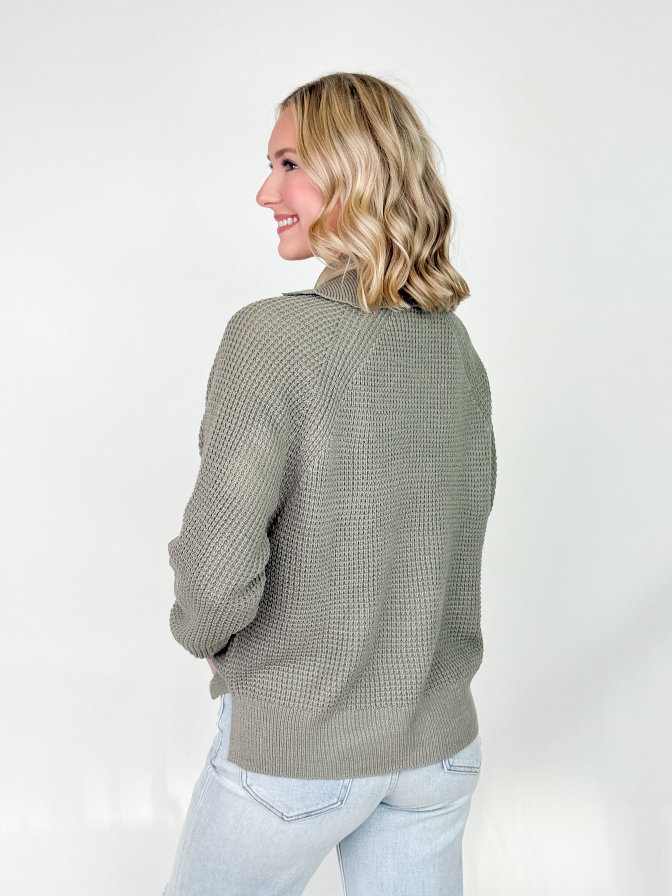 Elevate your wardrobe with the Matilda Sailor Collar Knit Sweater in olive. This sophisticated long-sleeve sweater features a distinctive sailor collar and a flattering V-neck secured by elegant metal snaps. Crafted in a textured waffle knit, it offers both comfort and refined style, perfect for layering or wearing on its own.