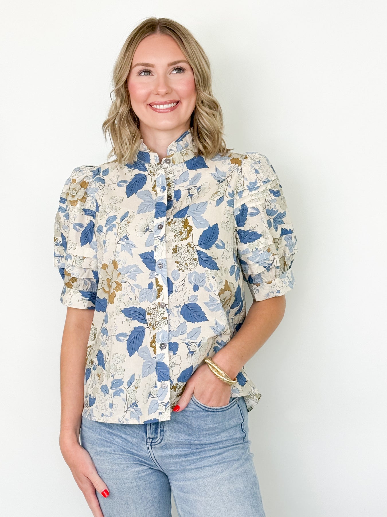Navia - Floral Puff Sleeve Button Down Top (Blue)