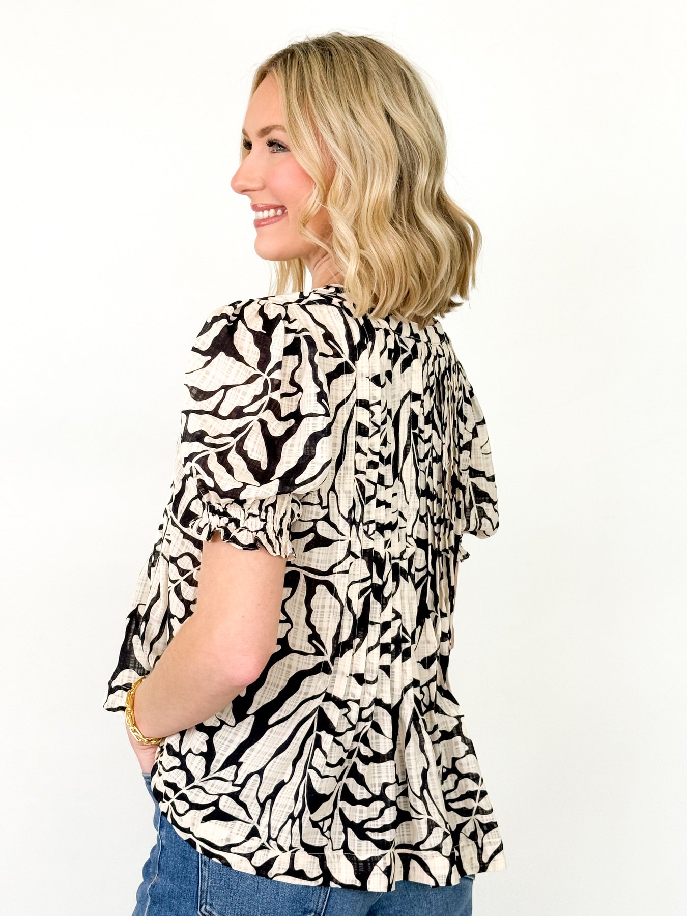 Introducing Keisha, the elegant printed swing top that exudes sophistication. With delicate pintuck details and a timeless black & cream color palette, this top is a must-have for any stylish and exclusive wardrobe. Elevate your look with Keisha and step into the world of luxury and art. Also available in blue!