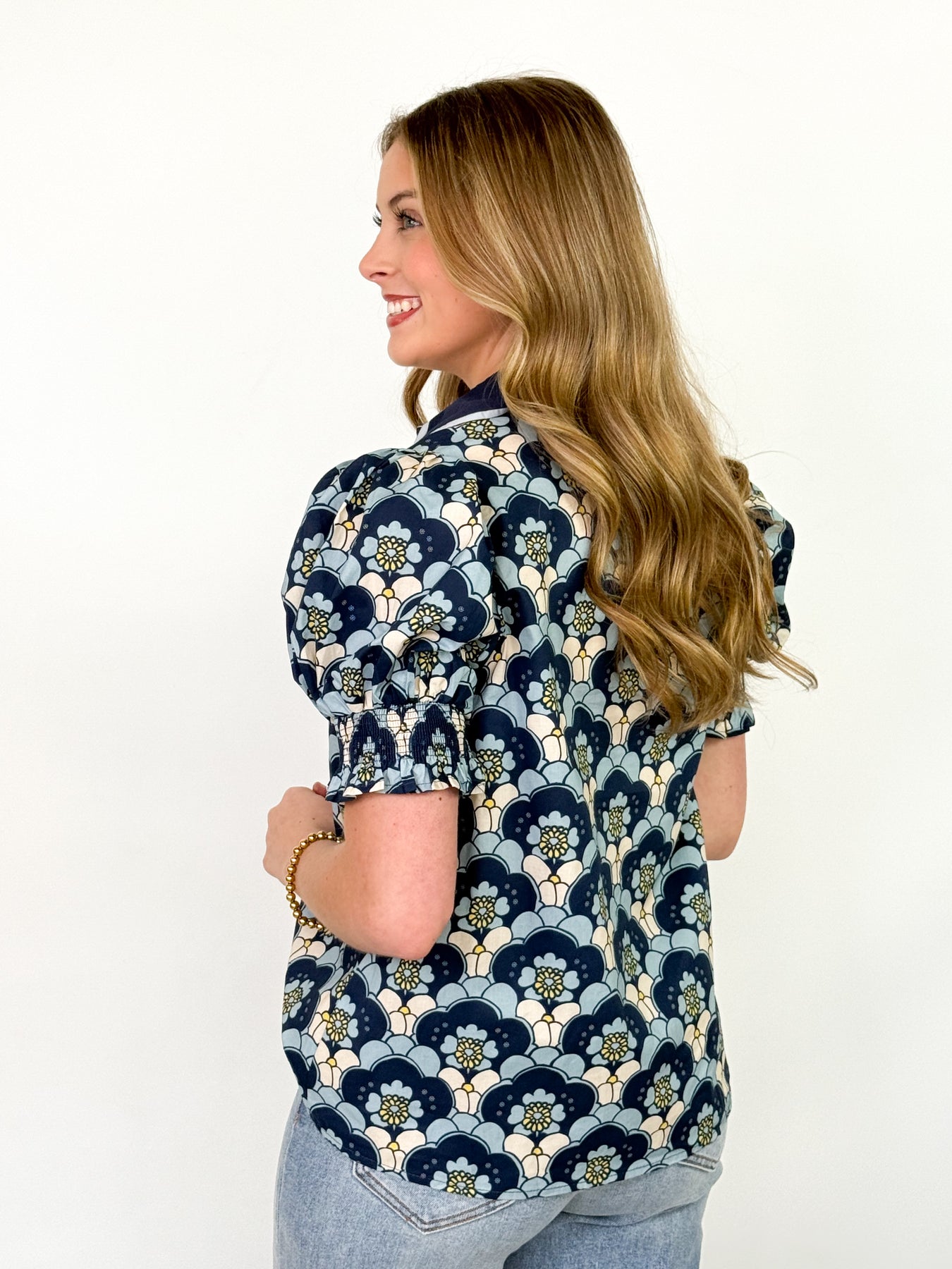 Add a splash of charm to your wardrobe with this playful navy blouse featuring an abstract floral pattern. The short puff sleeves with smocked cuffs add a flirty touch, while the contrasting V-neck collar brings a fun twist to your everyday look. Perfect for brightening up any outfit with effortless style.