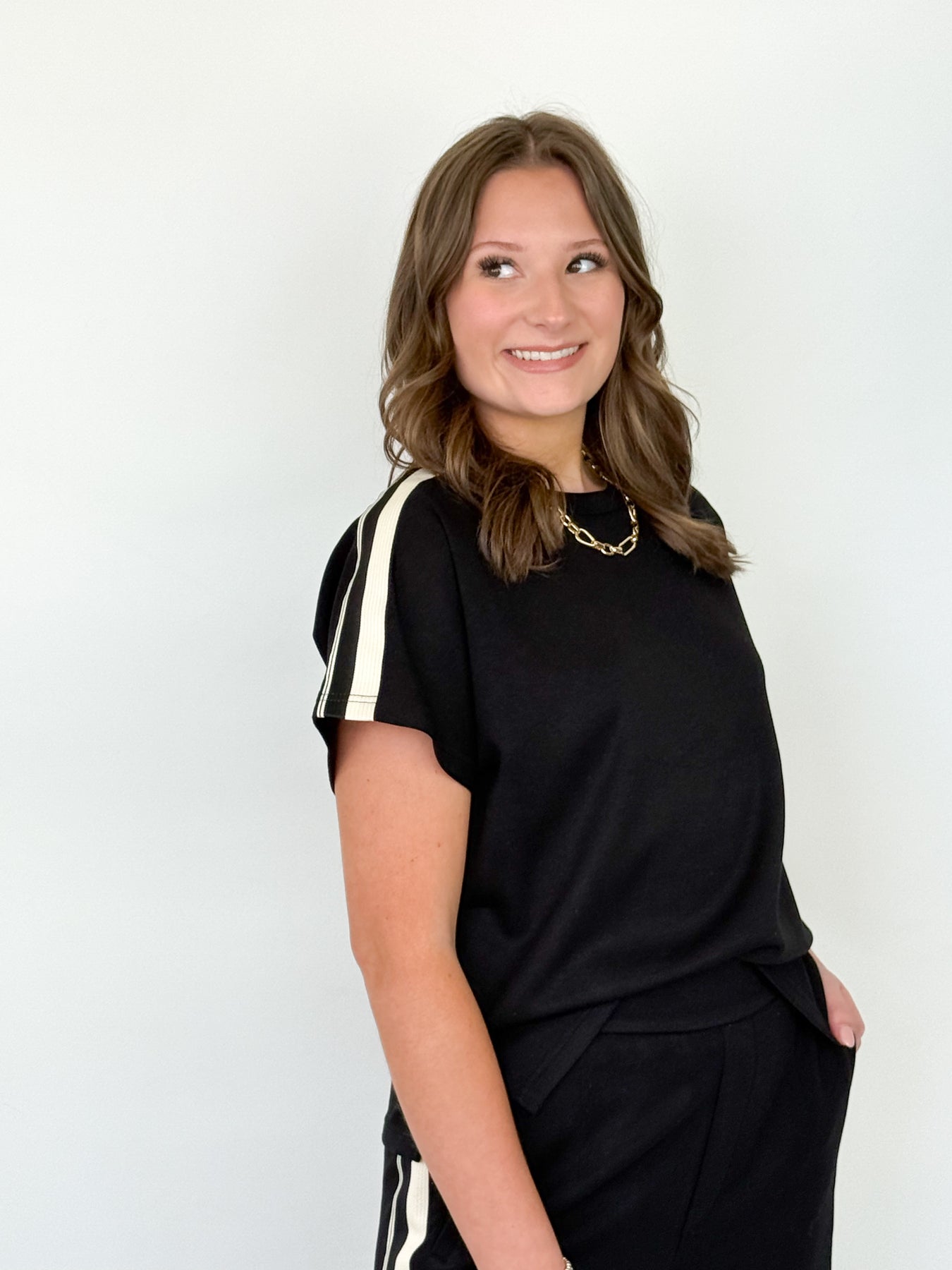 Introducing Tracey - the ultimate in sophisticated style. This black striped pant set exudes elegance with its striped details on the shoulders and down the legs. Crafted from soft scuba material, it features pockets and short sleeves for added convenience. Elevate your wardrobe with this exclusive piece.