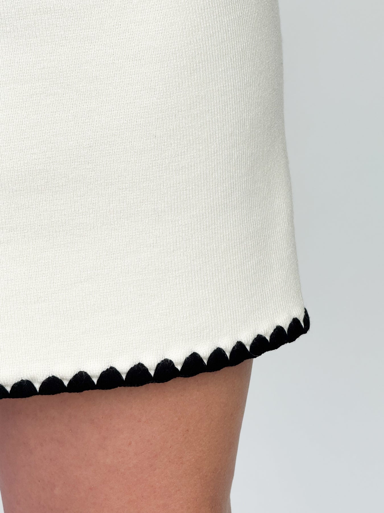 Elevate your wardrobe with the Wrenly set, featuring a cream-colored knit sleeveless vest adorned with elegant black scalloped trim and refined gold buttons. Paired with a matching pull-up skirt, this classic and chic ensemble offers timeless sophistication and effortless style for any occasion.
