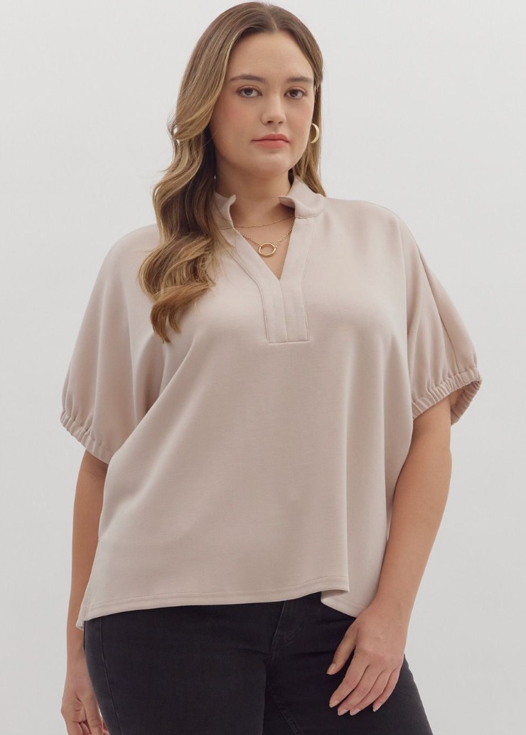 Gretta - V Neck Relaxed Top (Plus Size) - Almond