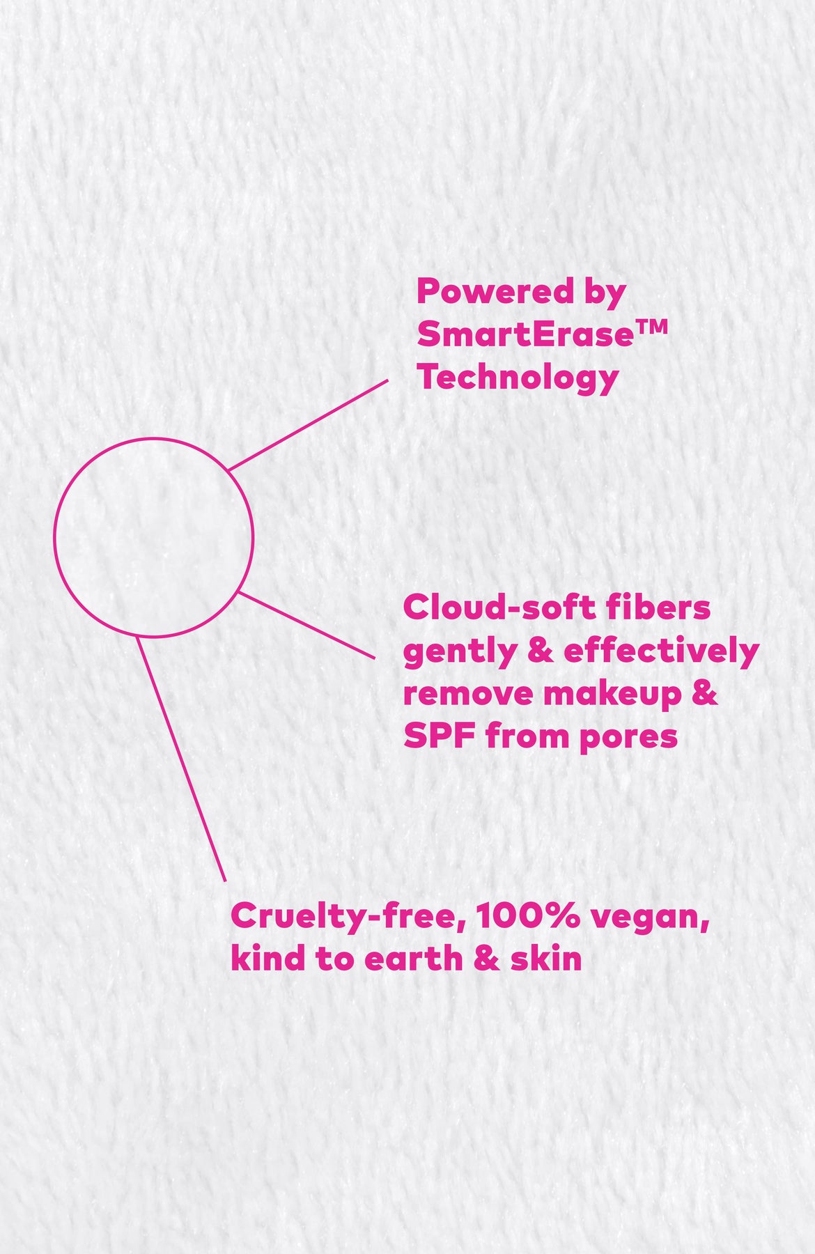 Includes: (7) daily cloths 5" x 4" & laundry bag Erase all makeup with JUST WATER™ including waterproof. Our patented, water-activated, cloud-soft fibers gently & easily remove all makeup & sunscreen from pores. 2 in 1 benefit: one side erases makeup & one side exfoliates skin. ✓ Dermatologist Recommended for sensitive skin ✓ SmartErase™ Technology ✓ Reusable & machine washable ✓ ALCOHOL & FRAGRANCE FREE ✓ Great for heavy makeup The Original MakeUp Eraser® is non-irritating and non-drying, making it perfect for sensitive skin. It's non-comedogenic, safe for lash extensions, & entirely oil-free for a fresh, comfortable skincare experience. Wet with warm water. The warmer, the wetter, the better! Use gentle circular motions to erase makeup with the short fiber side. Flip to long fiber side (side with tag) to exfoliate the skin. Sustainable, Skin Care, Eco Friendly