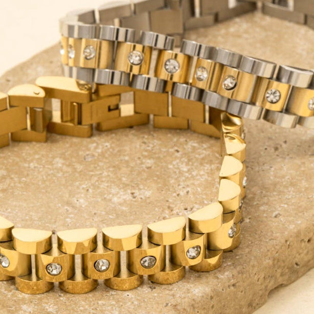 Rock a look that's equal parts edgy and elegant with this stainless steel studded watch chain bracelet. Crafted from 90% stainless steel and 10% rhinestone, it's the perfect accessory to add some sparkle and attitude to your everyday style. Whether you're dressing up or keeping it casual, this chain bracelet brings that effortless cool factor to any ensemble.
