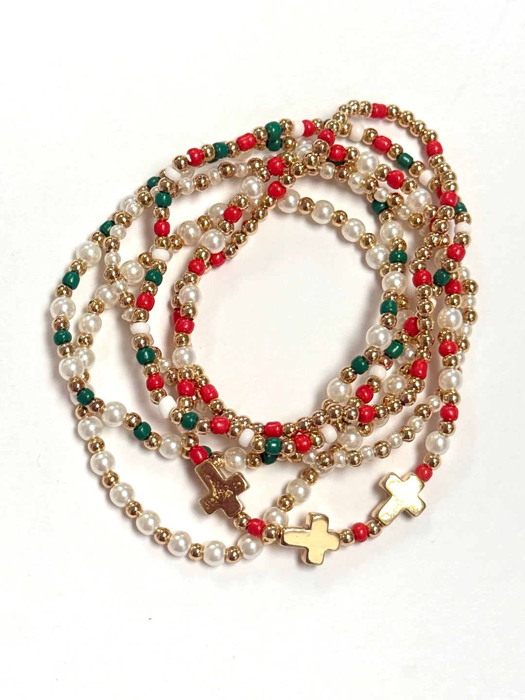 Dasher - Gold, Red, Pearl, & Green Beaded Cross Bracelet Set