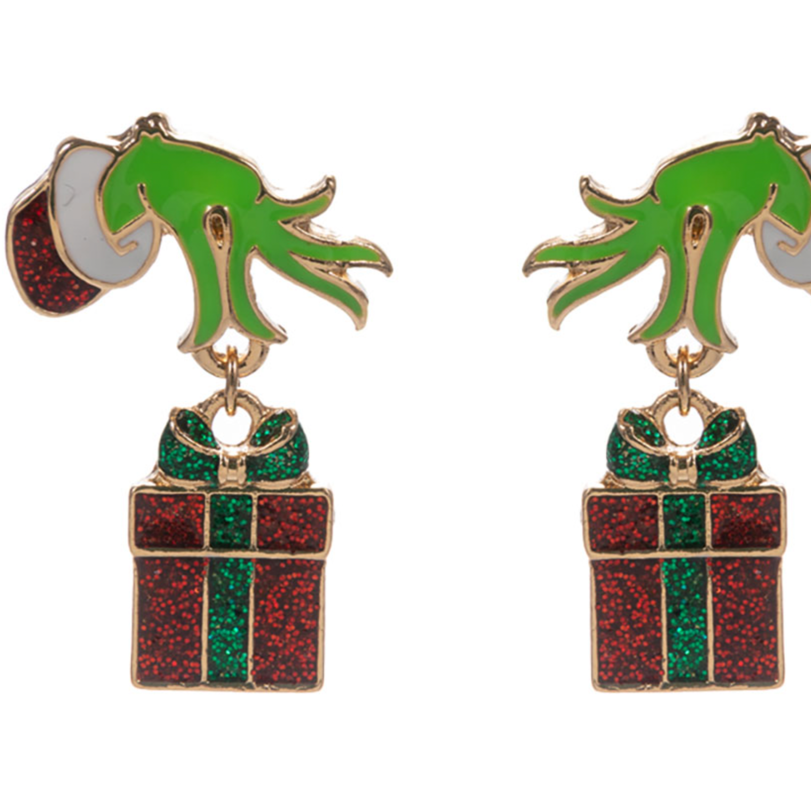 Elevate your holiday ensemble with these refined glittering gift box earrings, exquisitely accented by a whimsical Grinch hand. Measuring 0.7" by 1.25" with a durable titanium post back, they offer both elegance and comfort. Hypoallergenic and perfect for seasonal events, these earrings provide a subtle yet festive statement for sophisticated holiday celebrations.