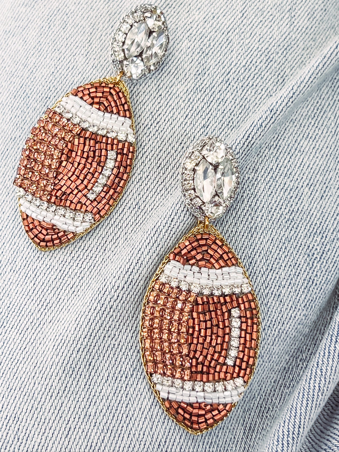 Score a touchdown with these fun football earrings from Taylor Shaye Designs! Made with rhinestones and beads, they’re the perfect way to show your team spirit on game day. (Go team!)
