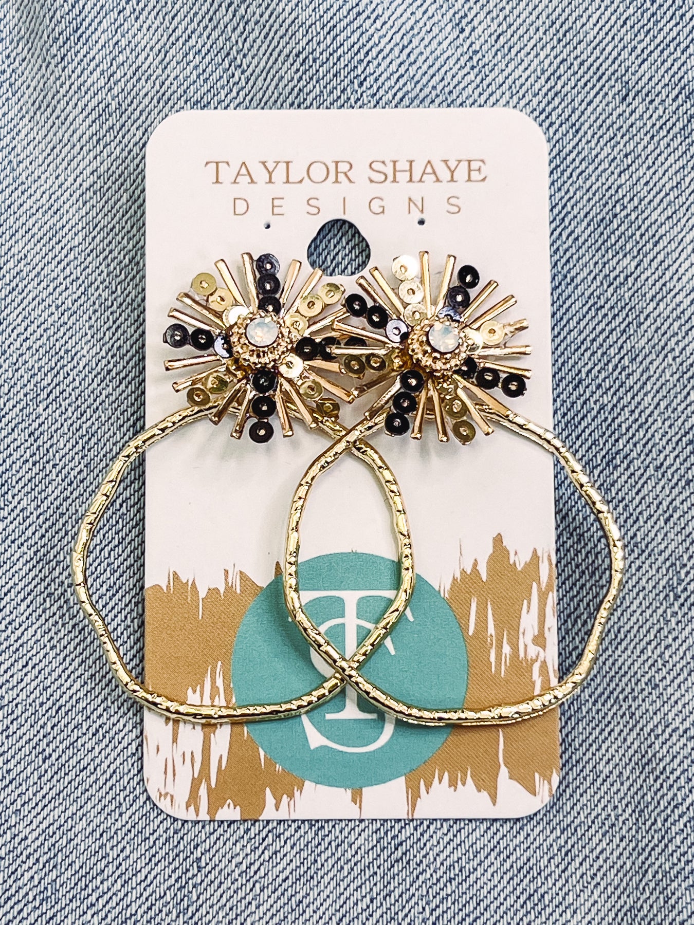 Introducing Taylor Shaye Designs' Black & Gold Sequin Sunburst Hoop Earrings! Let your beauty shine with these stunning golden hoops — 2" of pure glam. Perfect for a brunch date, game day or a night out, these are sure to elevate any look! #TreatYourself!