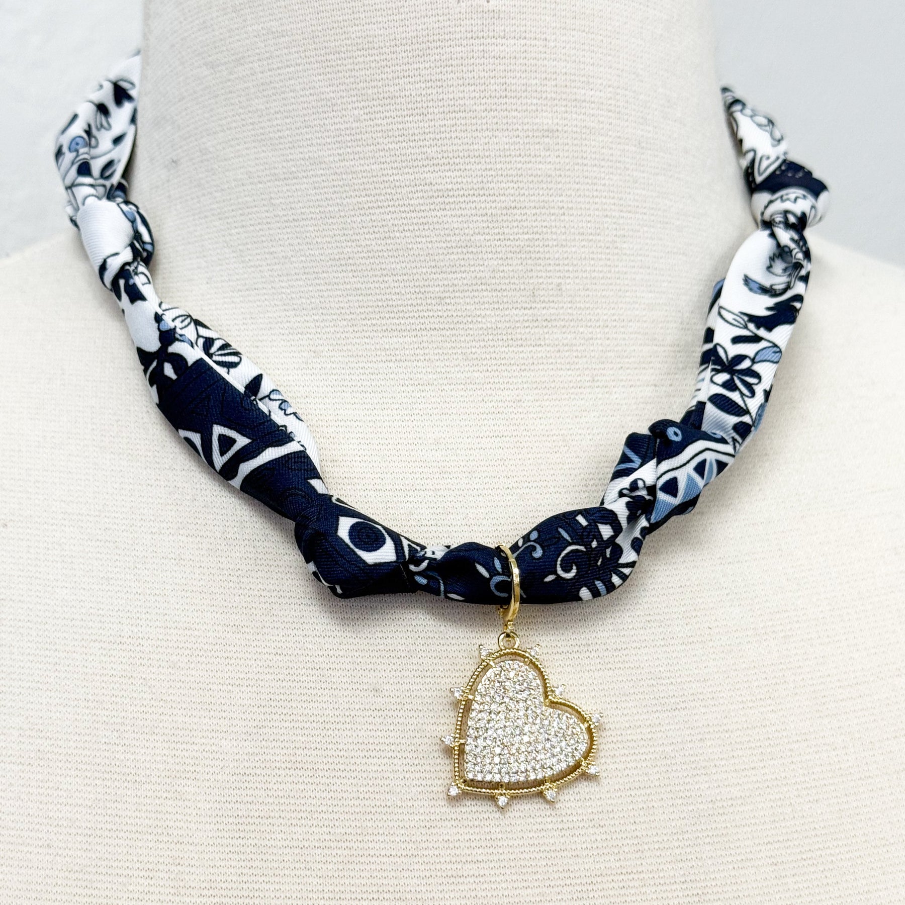 Gemelli - Rhinestone Edgy Heart Navy Knotted Scarf Necklace