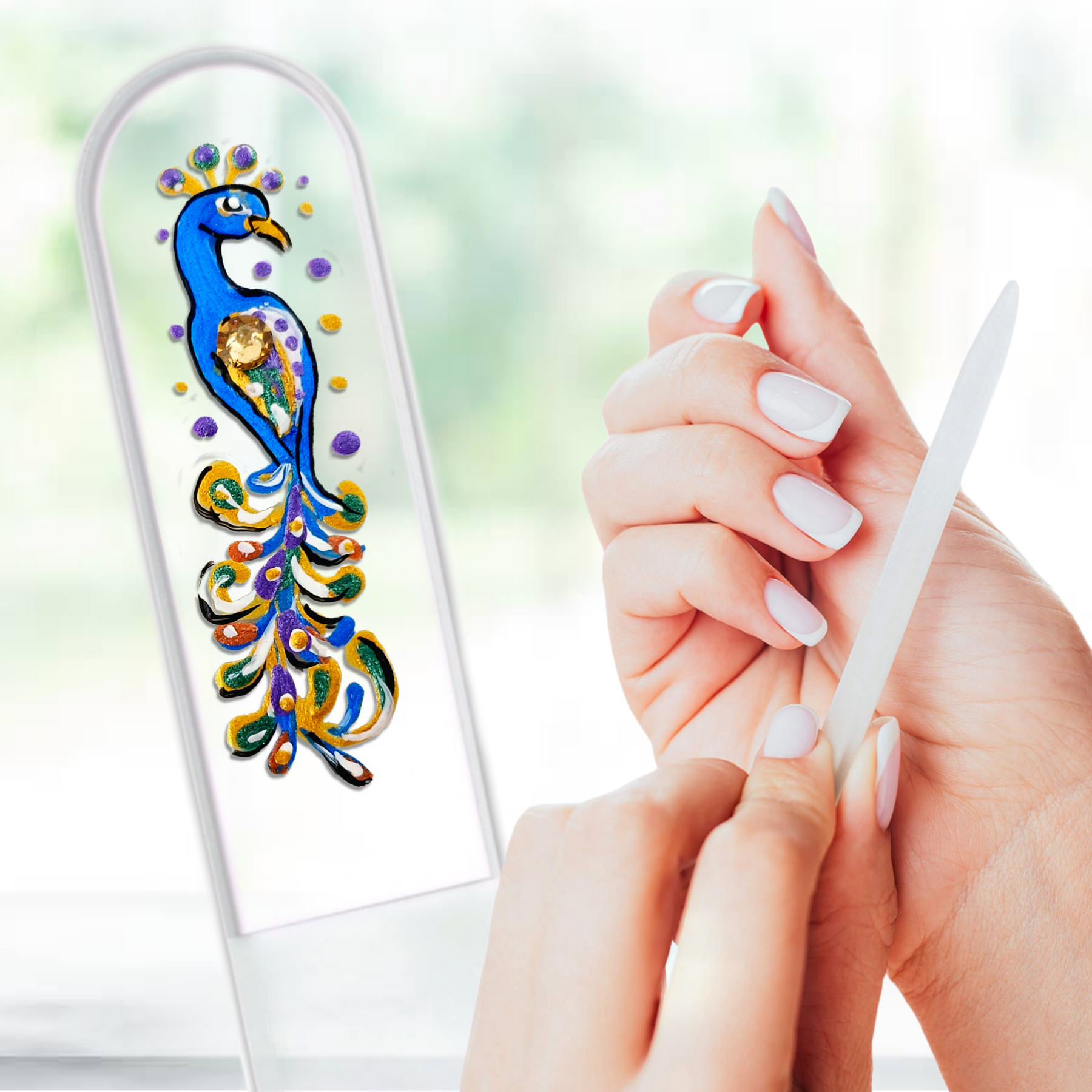 Crafted from premium tempered crystal glass, this hand-painted nail file combines artistry with exceptional functionality. The etched filing surface is permanently fused into the glass, delivering superior durability and consistent performance that outlasts standard alternatives. At 74% stronger than ordinary glass, the crystal construction withstands repeated use while maintaining its precision edge. The dual-sided design accommodates various filing techniques, and the non-porous surface sterilizes effortlessly between applications. Whether shaping natural or artificial nails, this file produces a refined finish without chipping or peeling. Each file has a protective plastic sheath for safe storage and portability. All hand painted. 5.5 inches