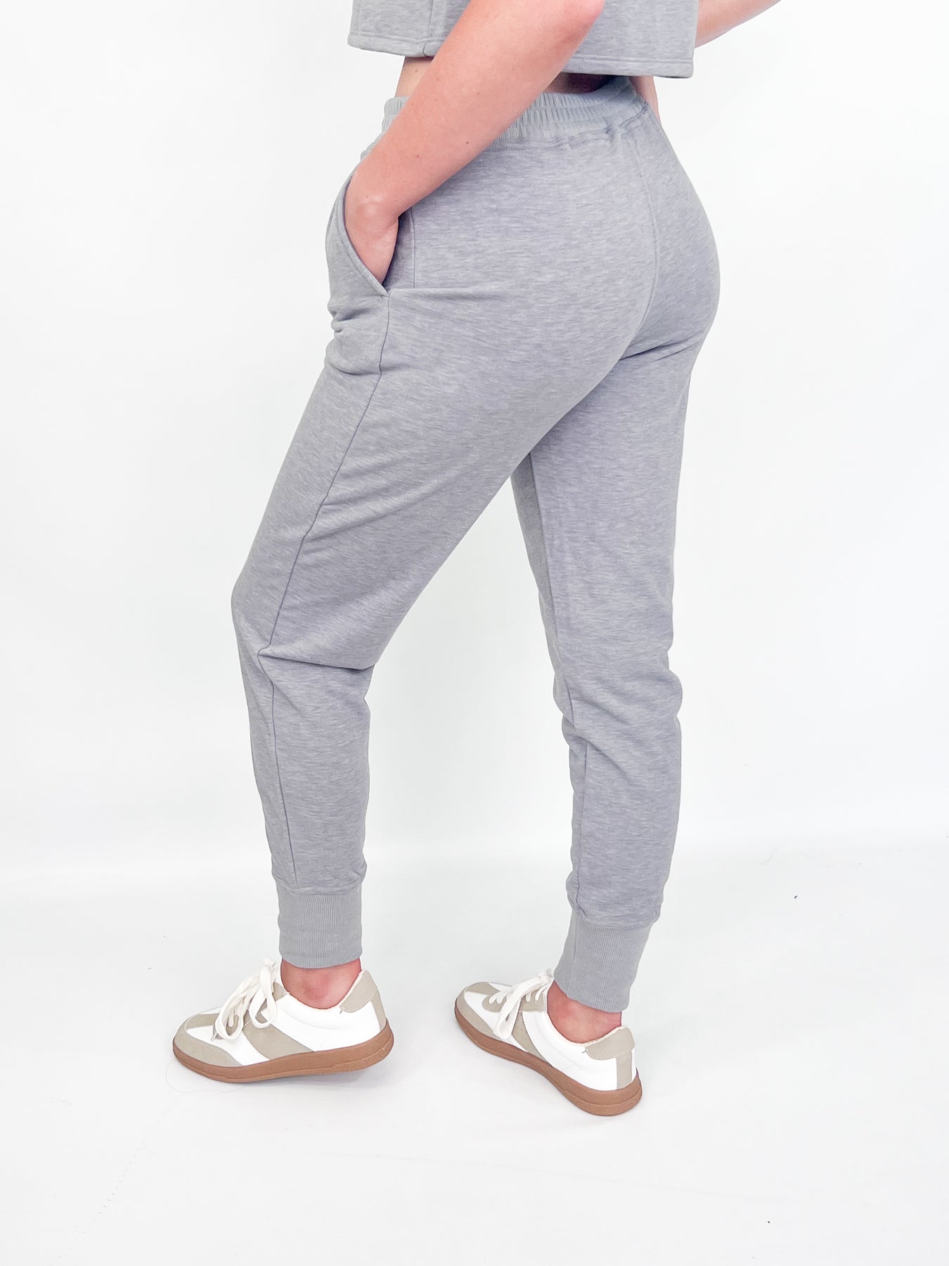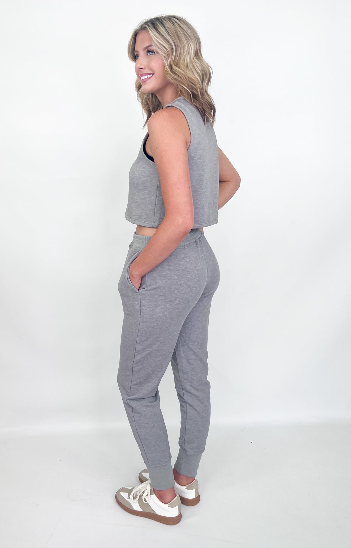 Get ready for ultimate comfort and style with our Eva - Sleeveless Tank & Jogger Set! This set includes a heather grey sleeveless tank with snap detail at the neckline, and joggers with front pockets, snap fly, and an elastic waistband. Made from a very soft material, it's perfect for lounging or running errands. Don't miss out on this must-have set!