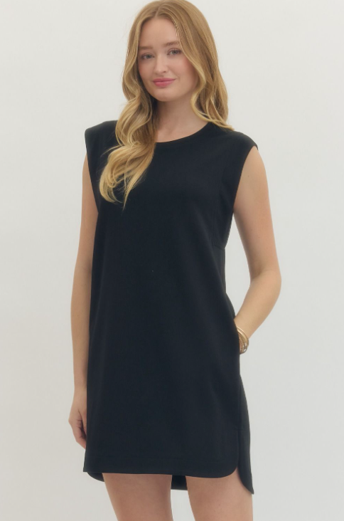 The Betsy black sleeveless mini dress combines effortless style with practical functionality. This casual piece features a streamlined silhouette perfect for warm-weather dressing, while functional pockets add everyday versatility. The sleeveless cut keeps things light and breathable, making it an ideal choice for layering or wearing solo. Whether you're running errands or meeting friends, the Betsy transitions seamlessly from day to evening with minimal effort.