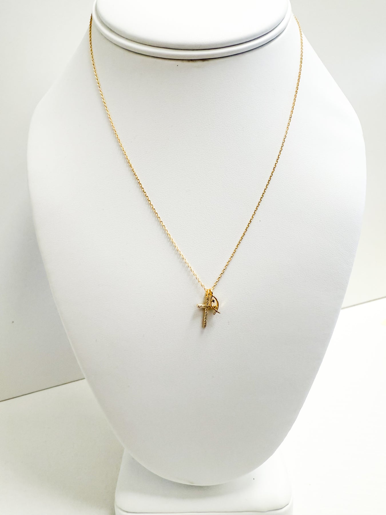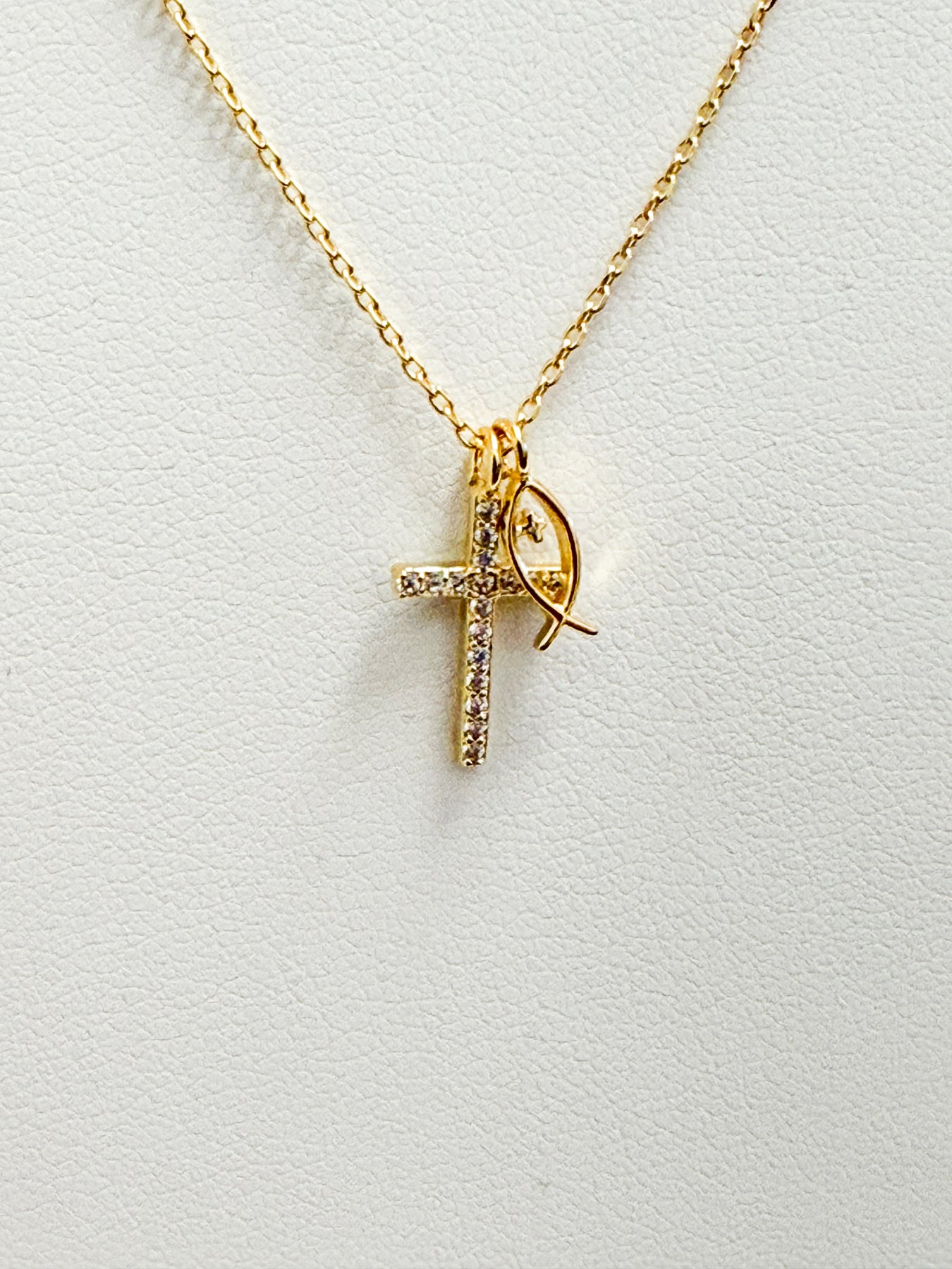 Taylor - Gold Dainty Rhinestone Cross + Ichthus Necklace