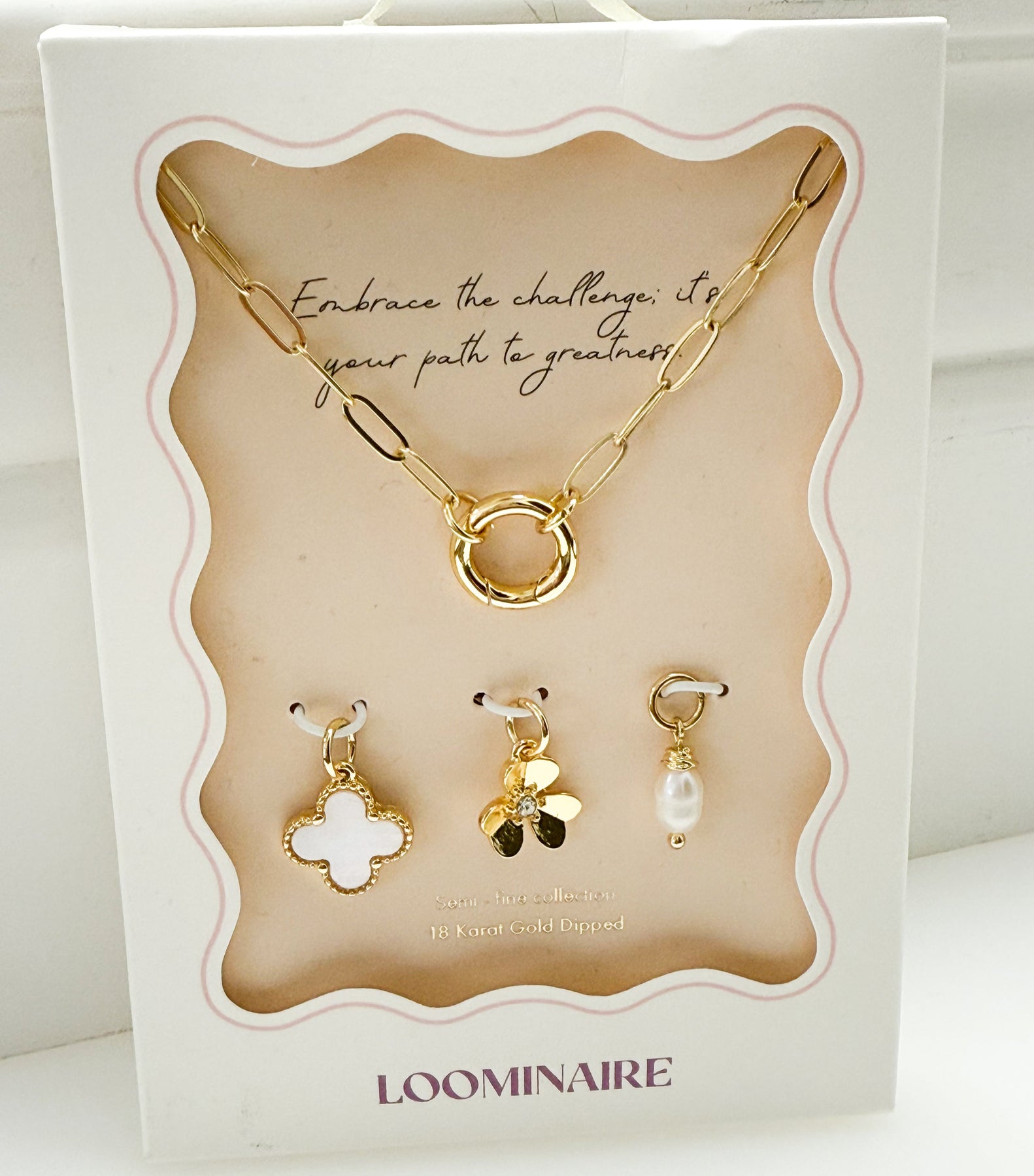 Add a touch of luck and sparkle with the Emmie Gold Chain Charm Necklace. This 16" 18K gold-dipped chain features a handy 2.5" extender and a secure lobster claw clasp for the perfect fit. A clever hinge attachment in the center lets you showcase your favorite charms, including a shimmering opal clover, a gleaming gold three-leaf clover, and a delicate pearl. Playful and charming, this necklace is ready to brighten any outfit with a little extra magic.