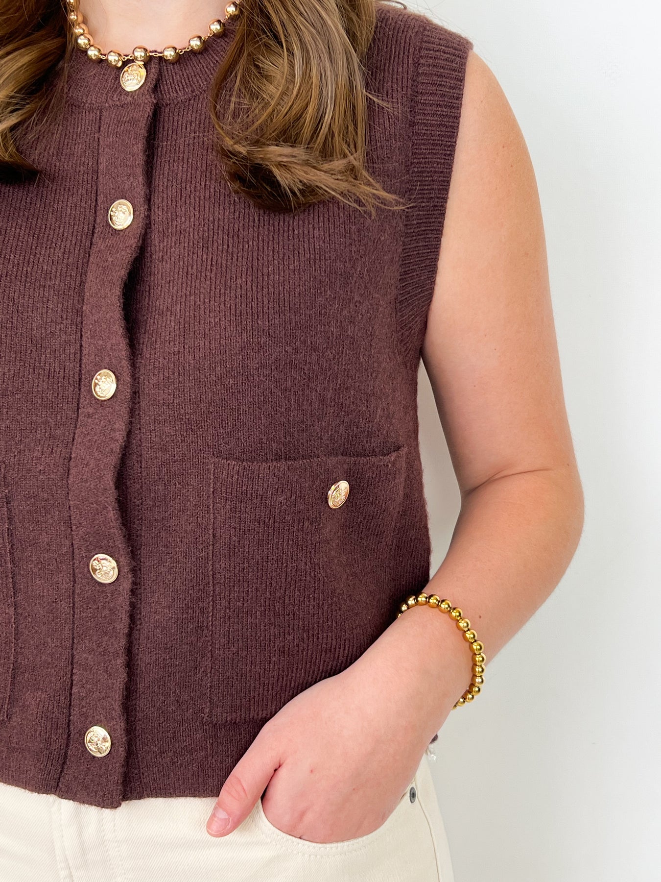 Add a dash of charm with the Felicia brown knit sweater vest! Soft and cozy, it features shiny gold buttons up the front and a cute little pocket to keep your style game on point. Perfect for layering fun and flair into any look.