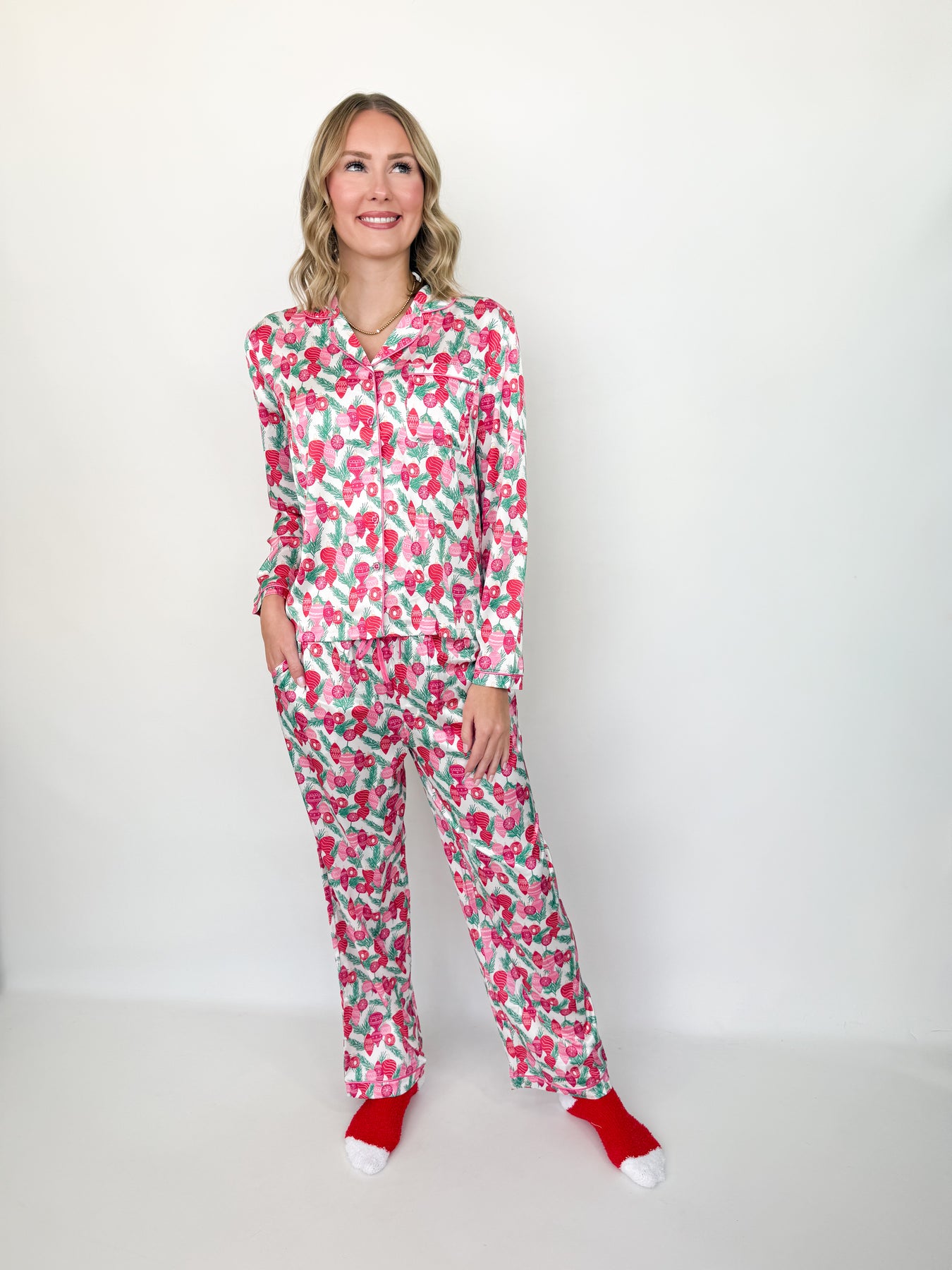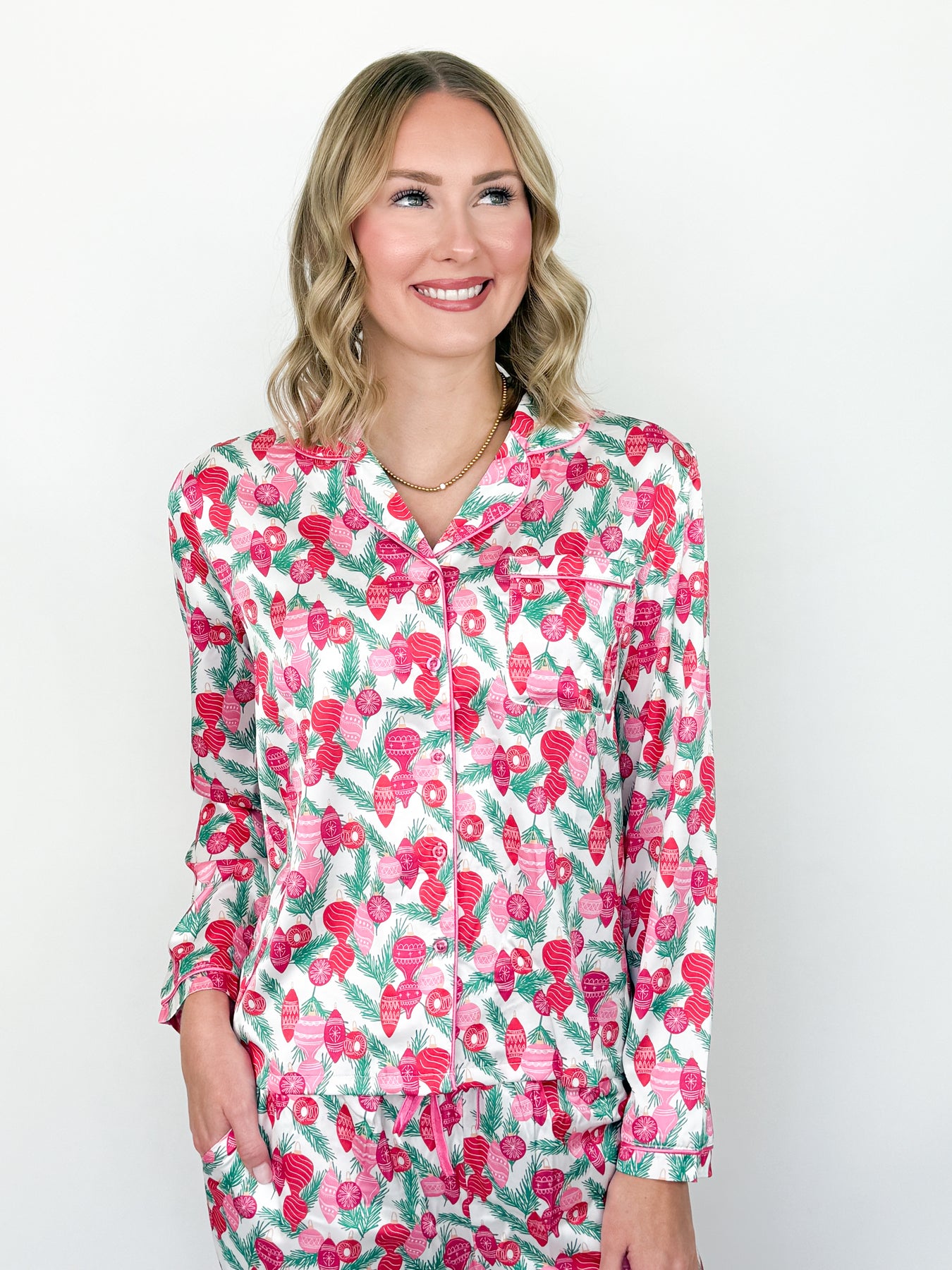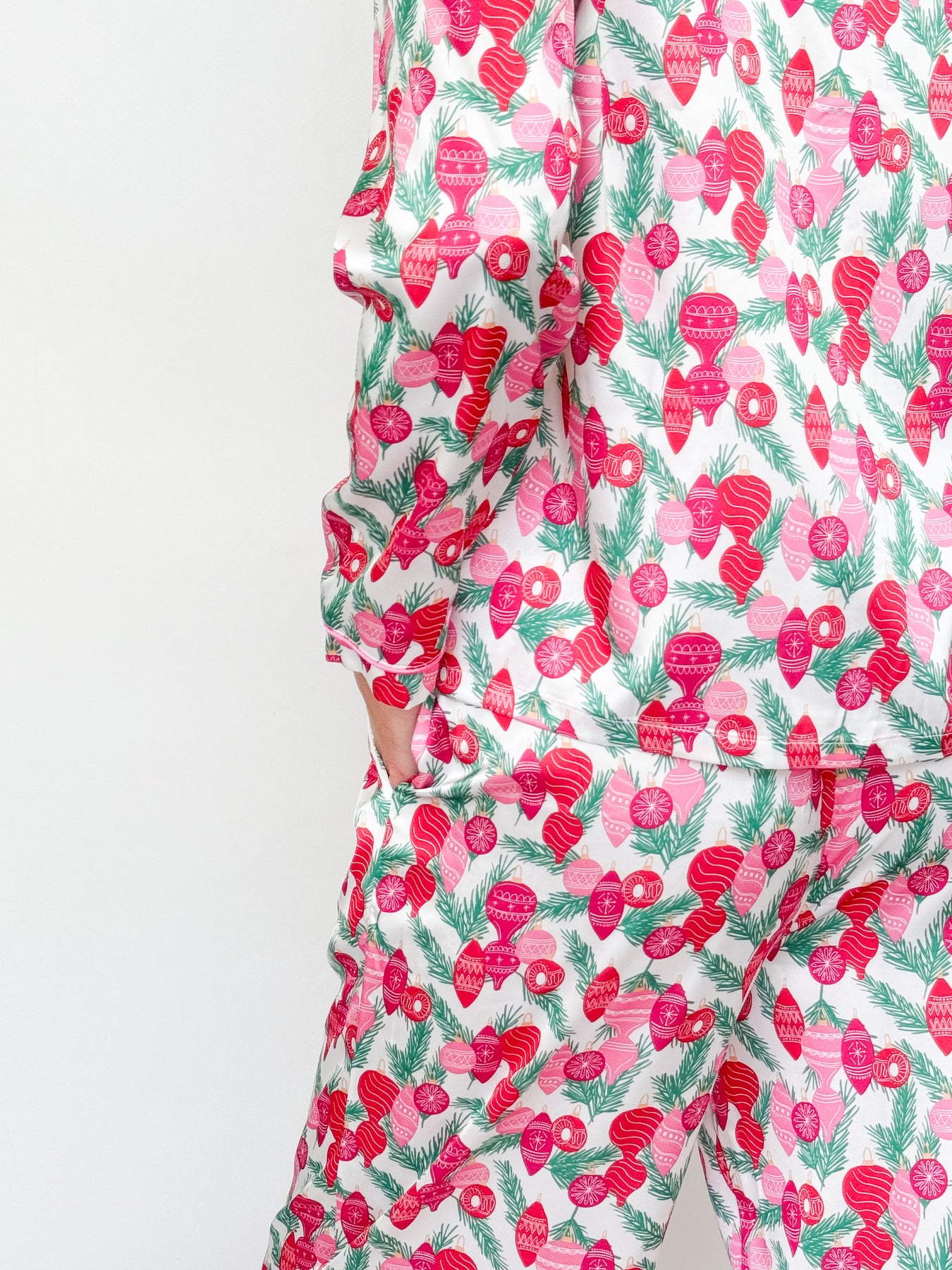 Add a splash of fun to your bedtime routine with the Charlotte Pink & Red Ornament Pajama Set. This satin set features a long-sleeve button-up top that feels smooth against your skin, paired with comfy drawstring pants for the perfect fit. The playful pink and red ornament pattern brings festive cheer, making lounging or sleeping a stylish delight. Cozy up in comfort and charm every night!