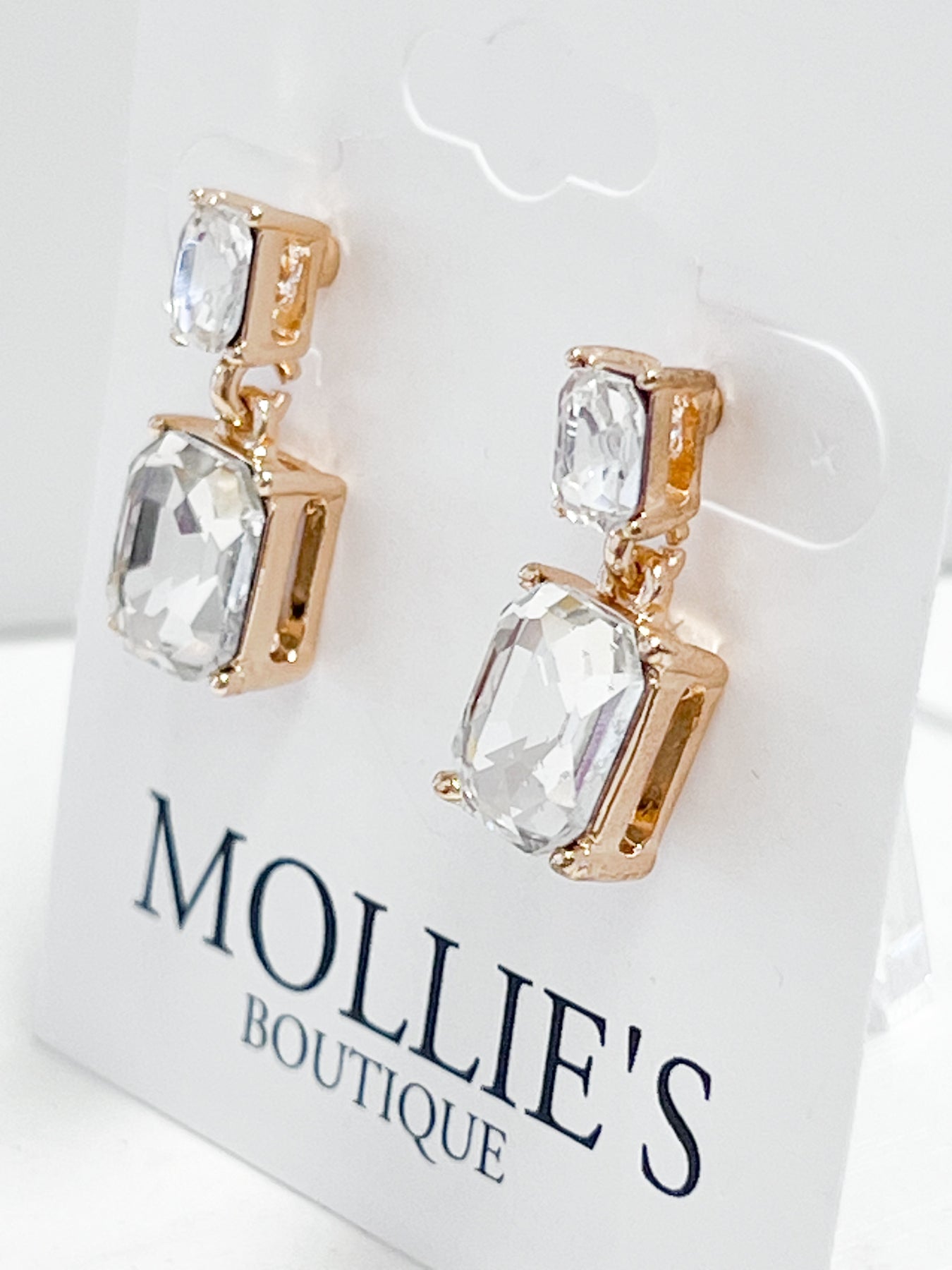 Add some sparkle to your look with Halsey's Rhinestone Mini Drop Earrings! These earrings feature .75 inch emerald cut stones in a classic gold setting and clear stones. With a post back closure, they're easy to wear and perfect for any occasion.