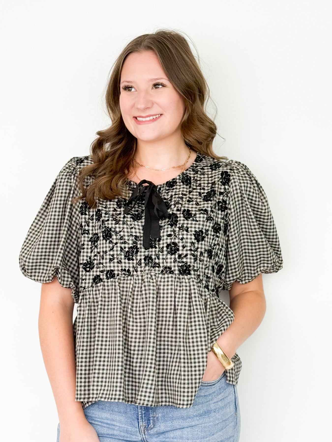 Allyssa - Black Gingham Embroidered Babydoll Top