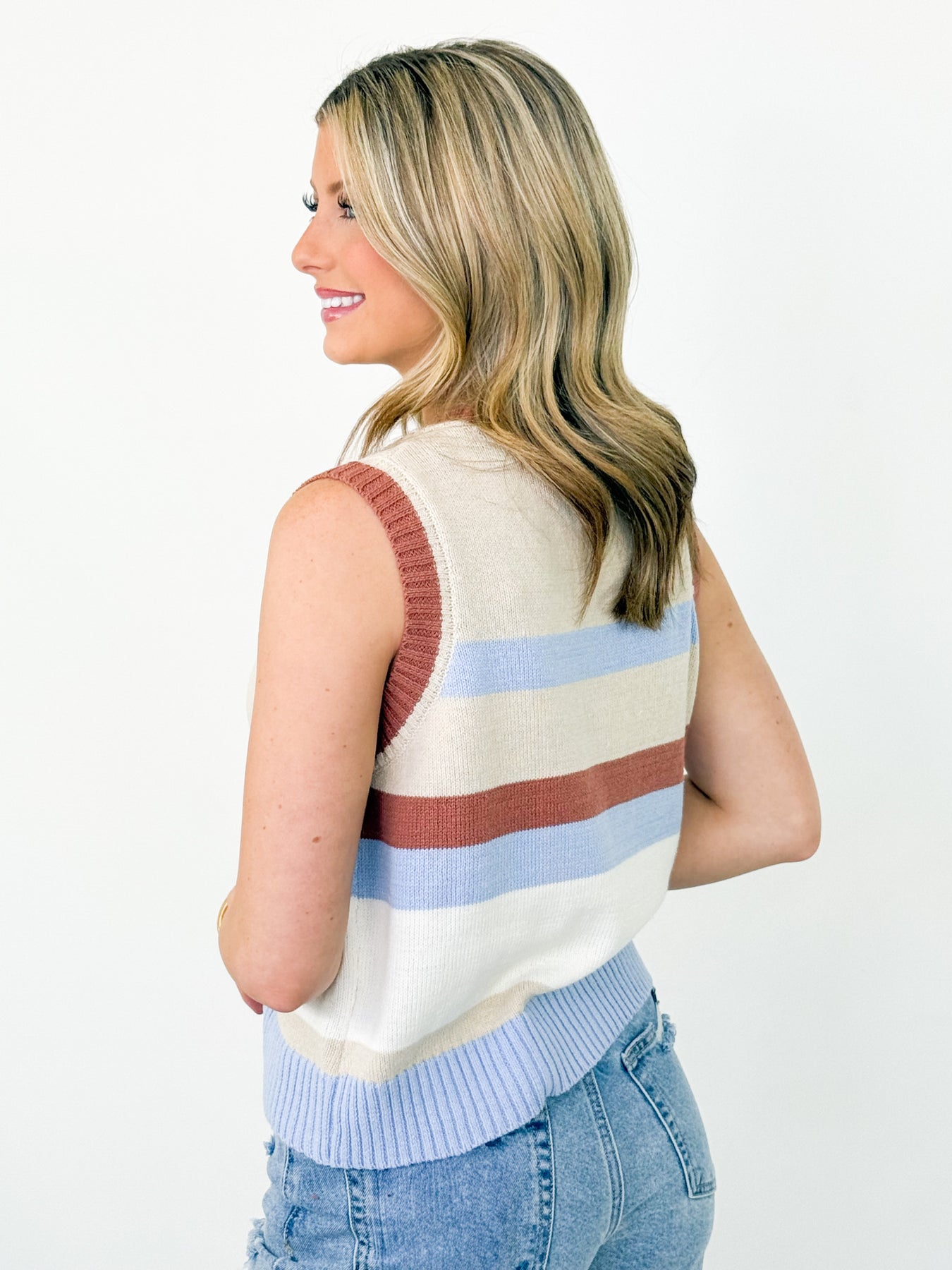 Add a playful twist to your wardrobe with the Erika Striped Button Up Sweater Vest. Featuring multicolored stripes in tan, terracotta, and powder blue, this vest is a fun and stylish addition to any outfit. With its button up design, it's easy to layer and add a unique touch to your look.