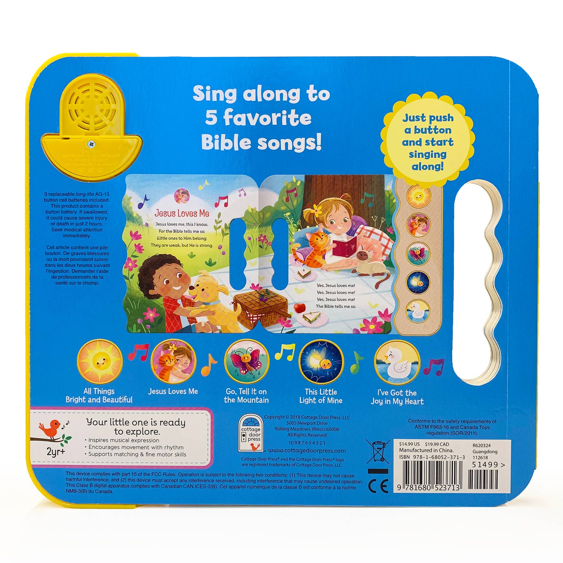 Enjoy a fun, family activity by reading and singing to 5 Bible songs! Read along to the lyrics of each familiar song and press the buttons on the wooden side panel to play sounds for your sing-along. Each button has a corresponding icon on the page to match the lyrics with the melody. Pushing the interactive buttons helps toddlers and babies develop fine motor skills, while singing builds early literacy skills. Religious songs included are All Things Bright and Beautiful, Jesus Loves Me, Go Tell It on the Mountain, This Little Light of Mine, and I've Got the Joy in My Heart. This adorable sound book is perfect for Easter gifts for kids, as well as other holidays and birthdays throughout the year.