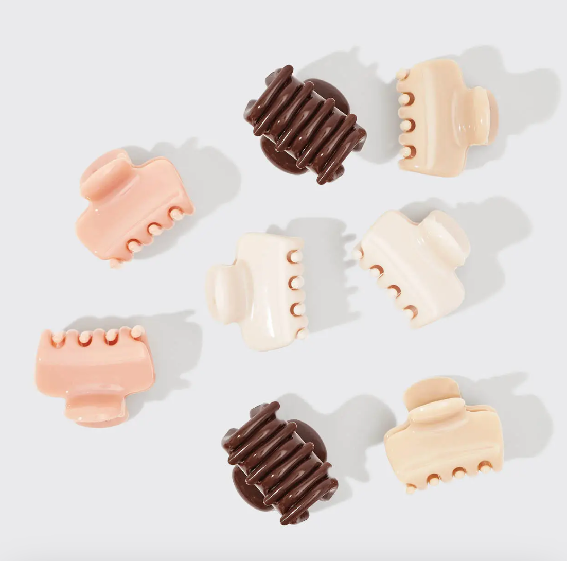 A must-have accessory for clipping back small sections of hair and adding a polished touch to your everyday look. This set of mini claw clips features our very own unique puffy design that offers a stylish way to pin up your bangs and clip short layers back from your face. Available in a range of neutral hues that complement any hair color and outfit. -Set of 8 mini claw clips in assorted neutral hues (2pcs in champagne, 2pcs in blush, 2 pcs in terracotta, and 2 pcs in brown) is perfect for clipping back small sections of hair -Our very own puffy-shaped design adds cute factor to a casual look -Eco-friendly; made from recycled acrylic material