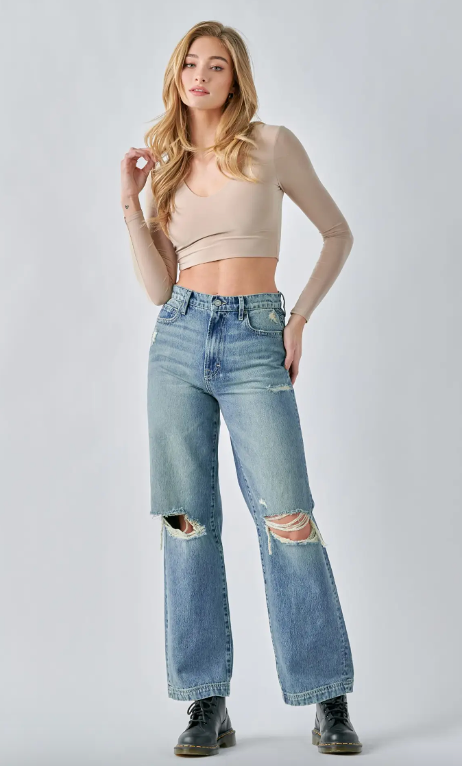 Experience luxury and comfort with our Logan High Rise Dad Jeans. Crafted from premium denim, these jeans feature a flattering high rise and unique holes at the front of the knees for a chic touch. The medium wash adds a sophisticated touch, while the five pockets and wide leg provide functionality. Zipper closure and belt loops complete