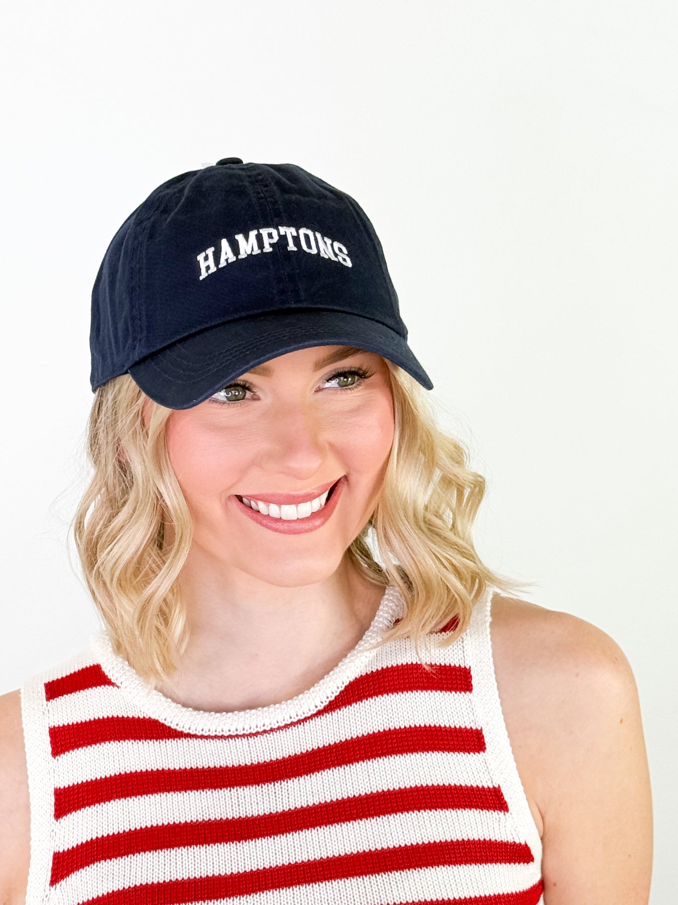 Get ready to hit the beach in style with our Navy Hamptons baseball hat! The navy blue cap features "Hamptons" in white embroidery and an adjustable back for the perfect fit. Great for any outdoor adventure, this quirky hat is a must-have for your summer wardrobe.
