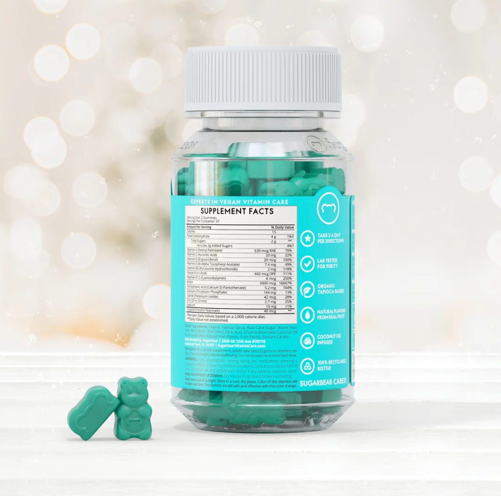 • Vitamin A, Vitamin D, Vitamin E, Vitamin B6, Vitamin C, Folic Acid, Biotin, Inisitol, Zinc, Vitamin B12, Iodine, Pantothenic Acid, Sodium, Organic Tapioca Syrup, Raw Cane Sugar, Water, Vitamin B12, Gelling Agent (Fruit Pectin), Acidity Regulators (Citric Acide, Sodium Citrate, Vitamin A, Natural Fruit Flavorings, Pantothenoic Acid,, Biotin, Inositol, Coconut Oil, Glazing Agent (Carnauba Wax), Vitamin E, Vitamin C, Vitamin D2, Zinc, Iondine, Folic Acid, Vitamin B6, Choline Bitartrate